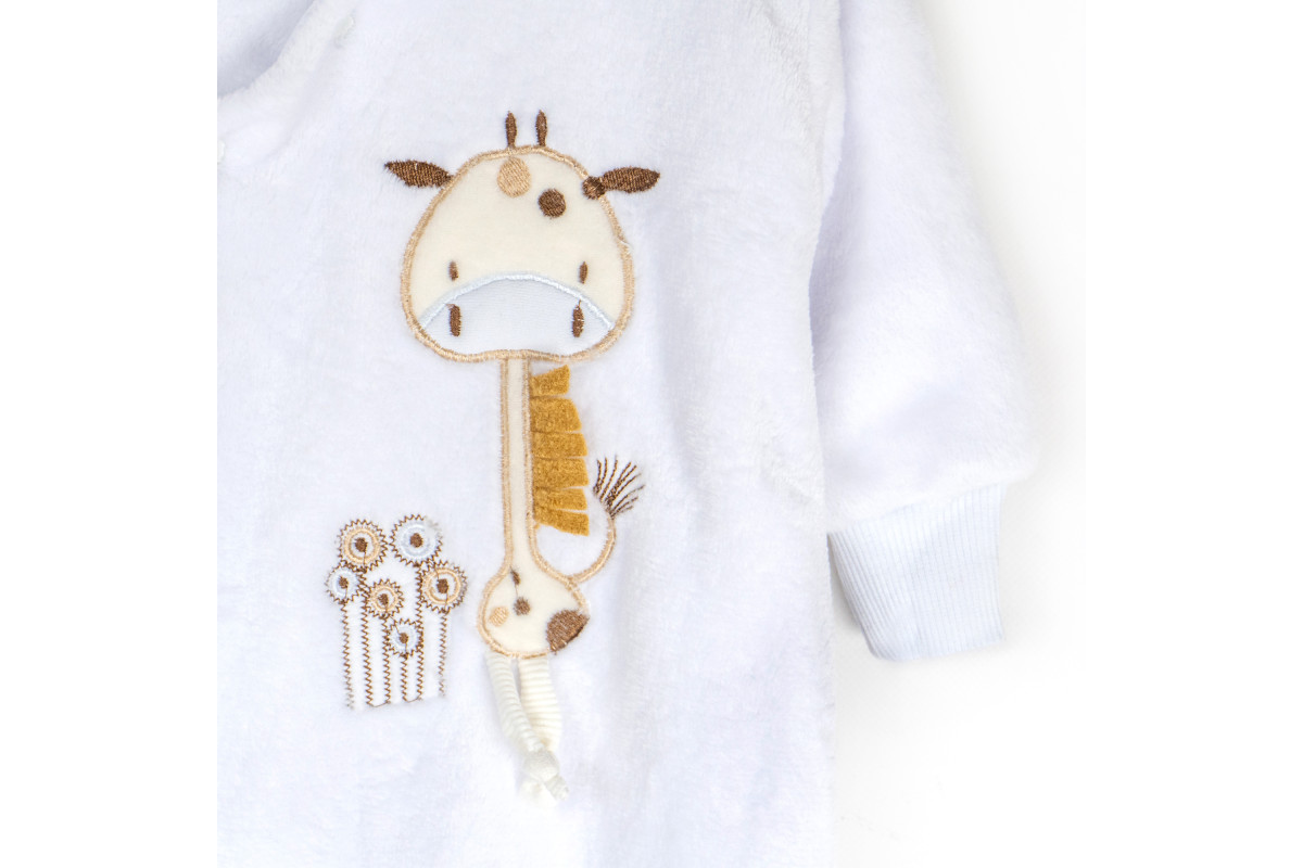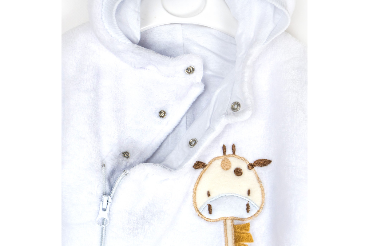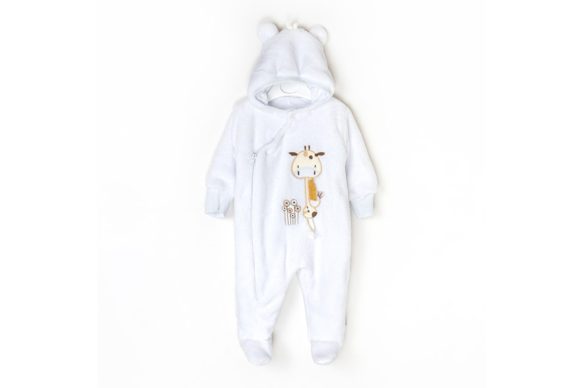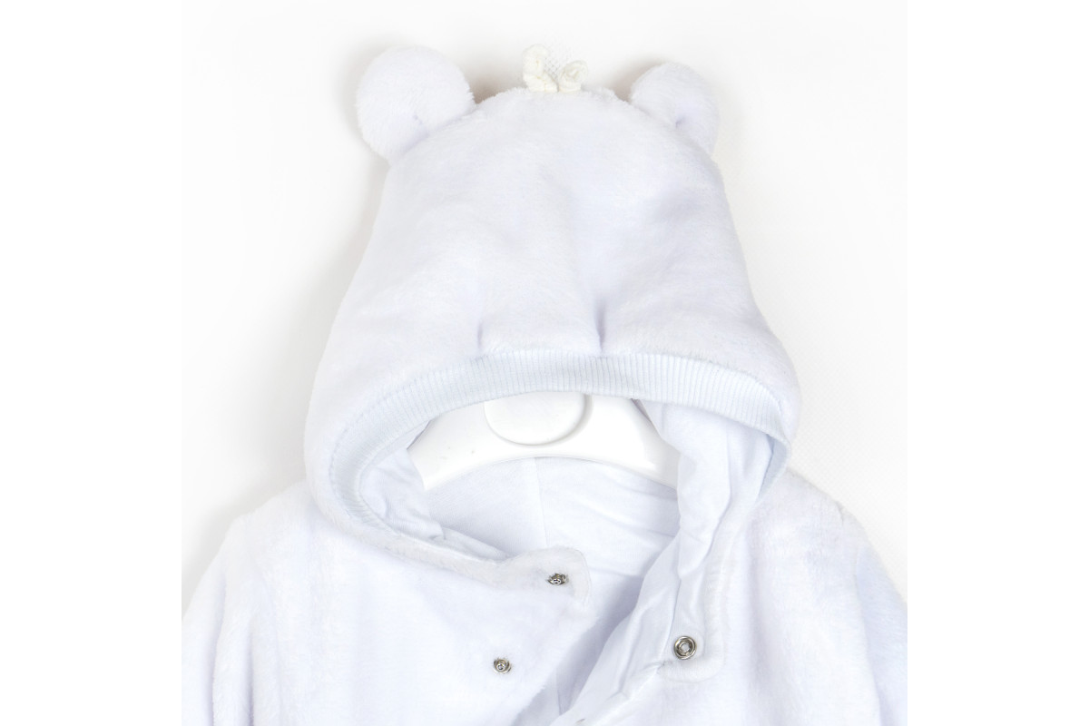Имеет капюшон с ушками, открытые рукавчики и закрытые стопы ножек.