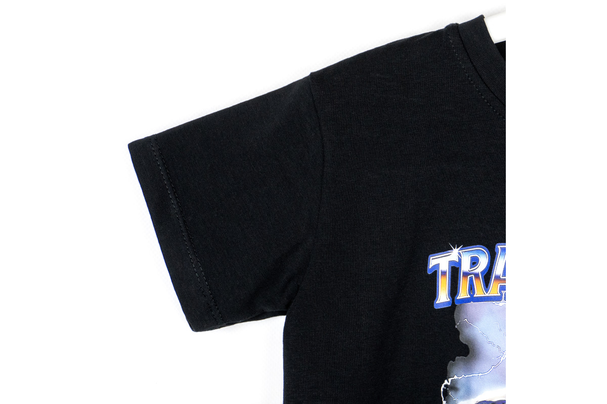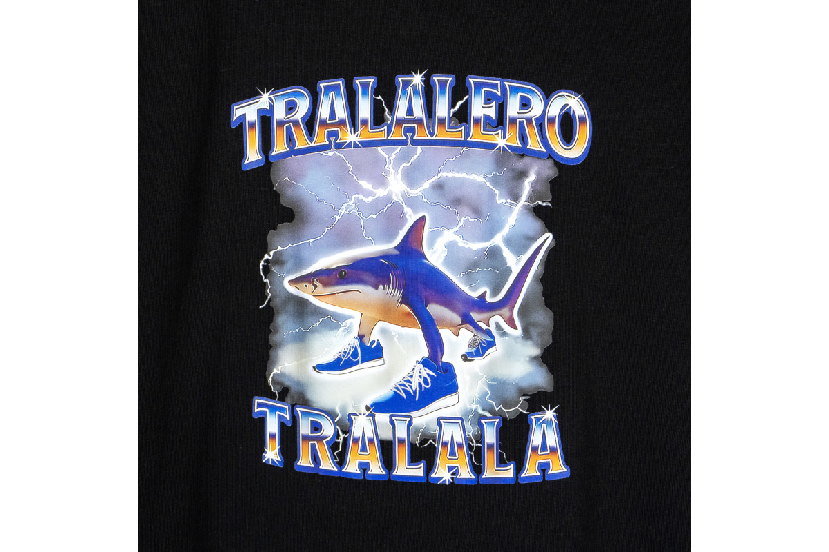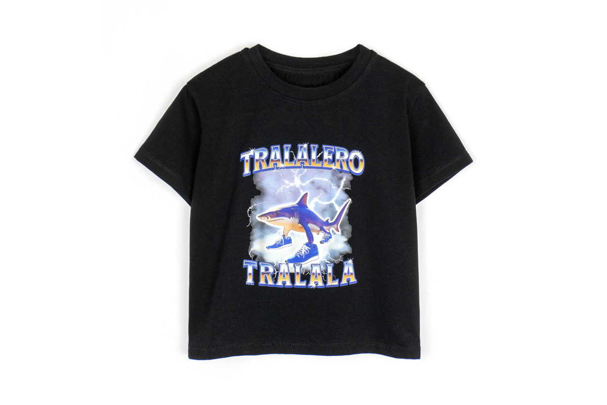 Модель выполнена в практичном чёрном цвете, а главный акцент — трендовый и запоминающийся принт Tralalero Tralala. Этот персонаж уже стал культовым в детской моде и интернете.