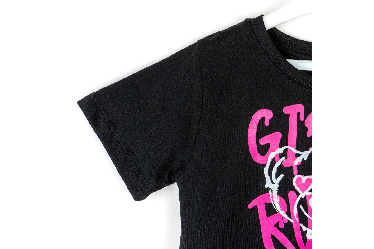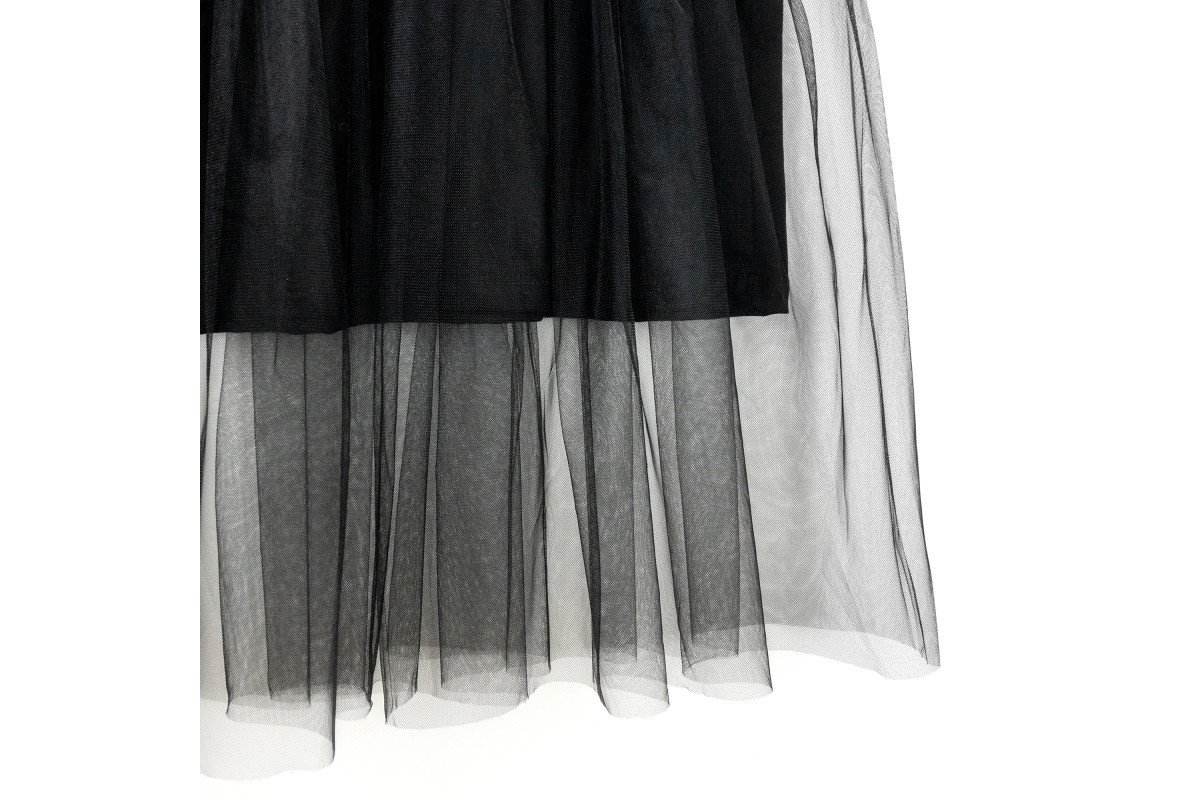 Стильное платье для девочки с коротким рукавом черного цвета с принтом и фатиновой юбочкой.
