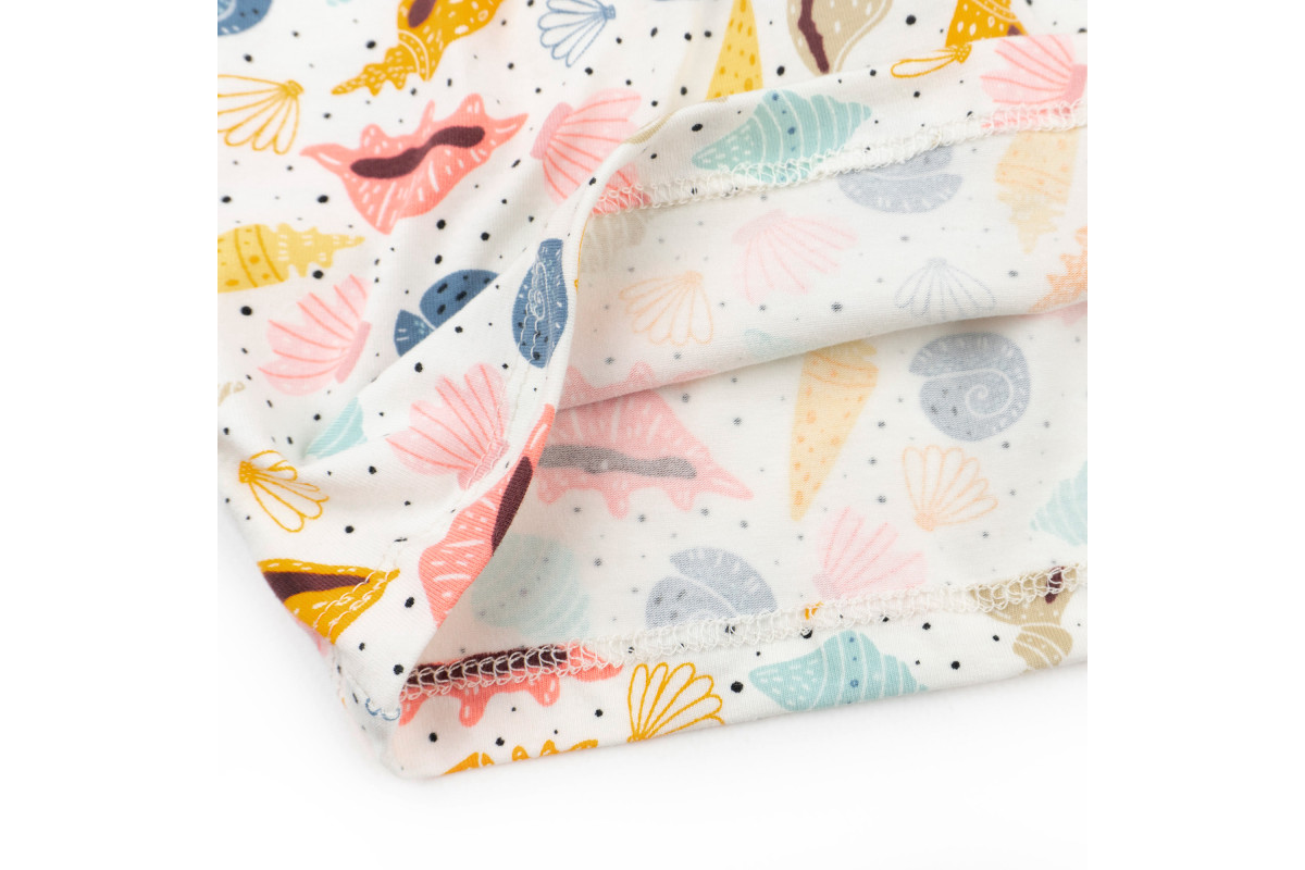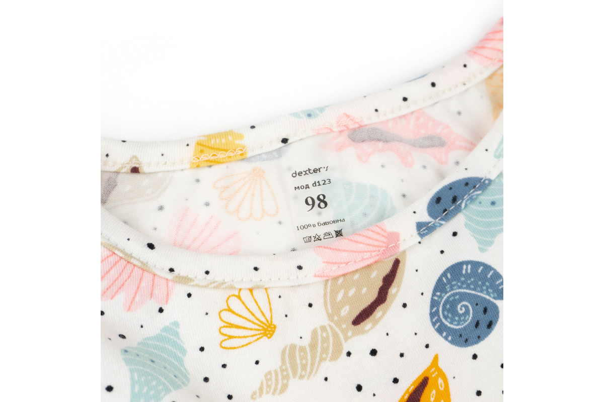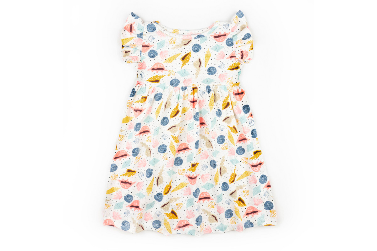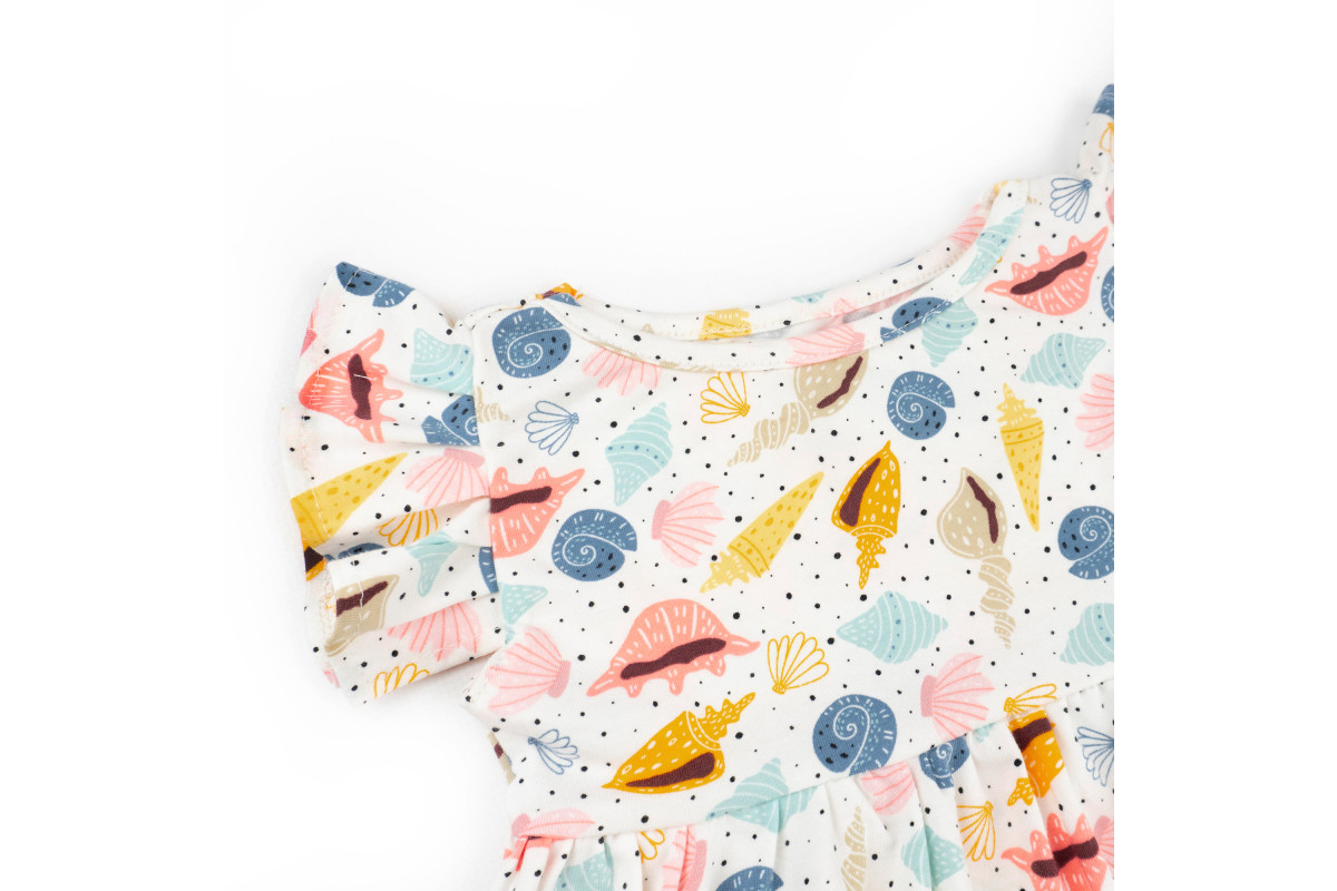 Летнее платье для девочки в яркой расцветке - молочного цвета с разноцветными ракушками.
