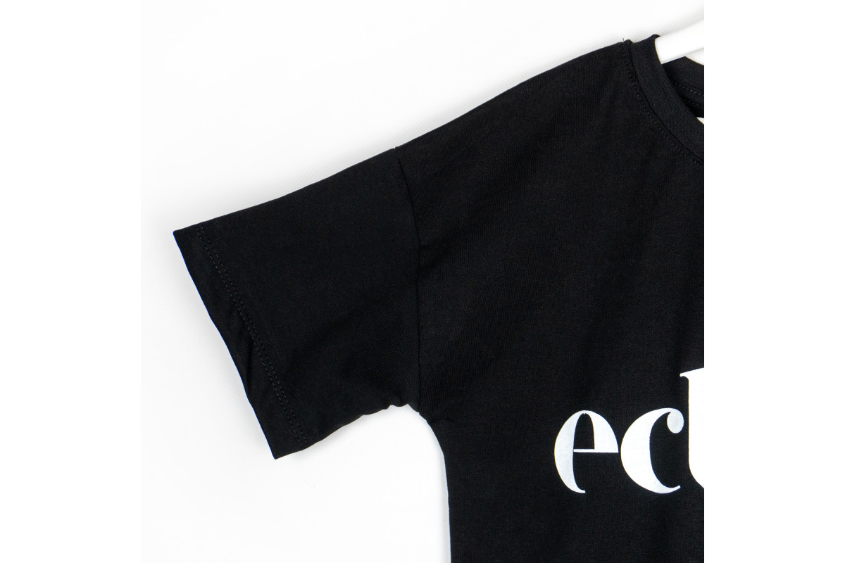 Платье чорного цвета украшено принтом в виде надписи.