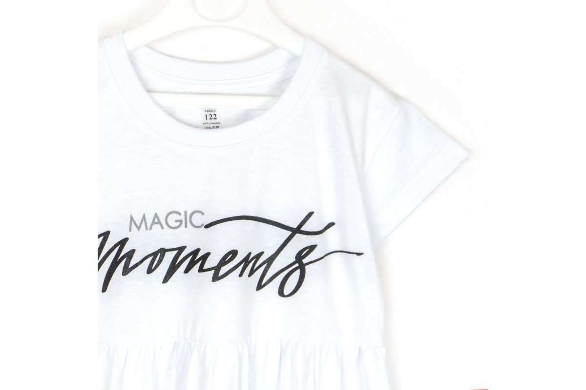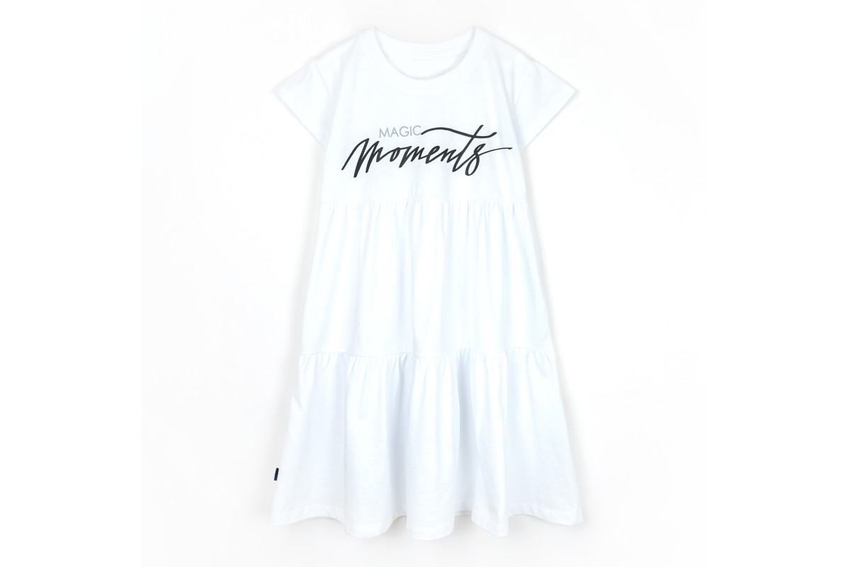 Имеет короткий рукав, пошито рядами, пышная юбочка.