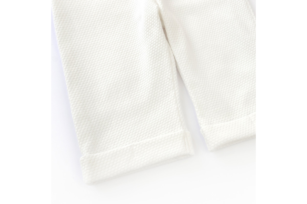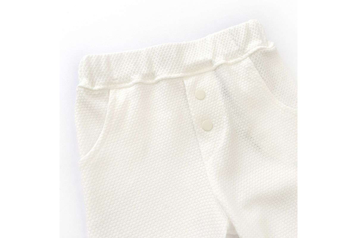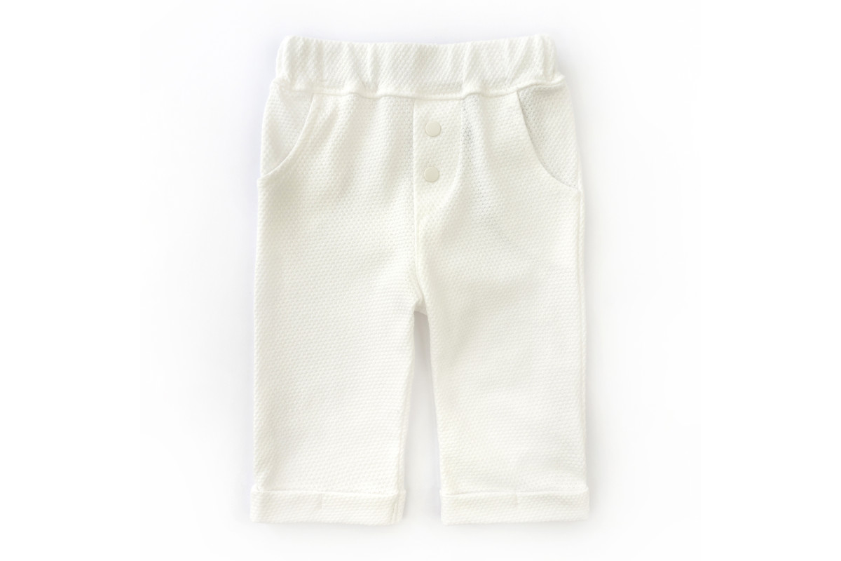 Штанишки на удобной резинке, имеют карманы и украшены кнопочками спереди.