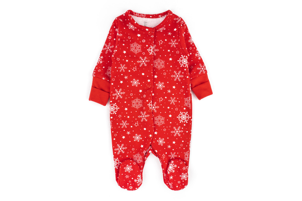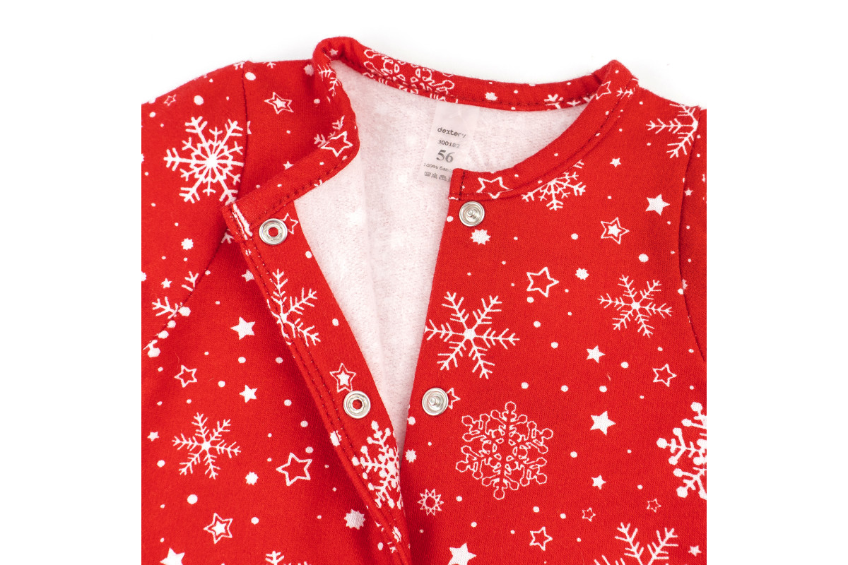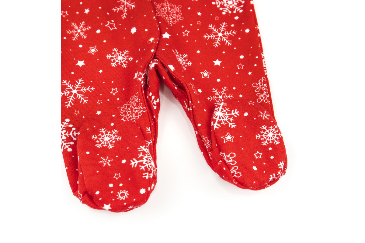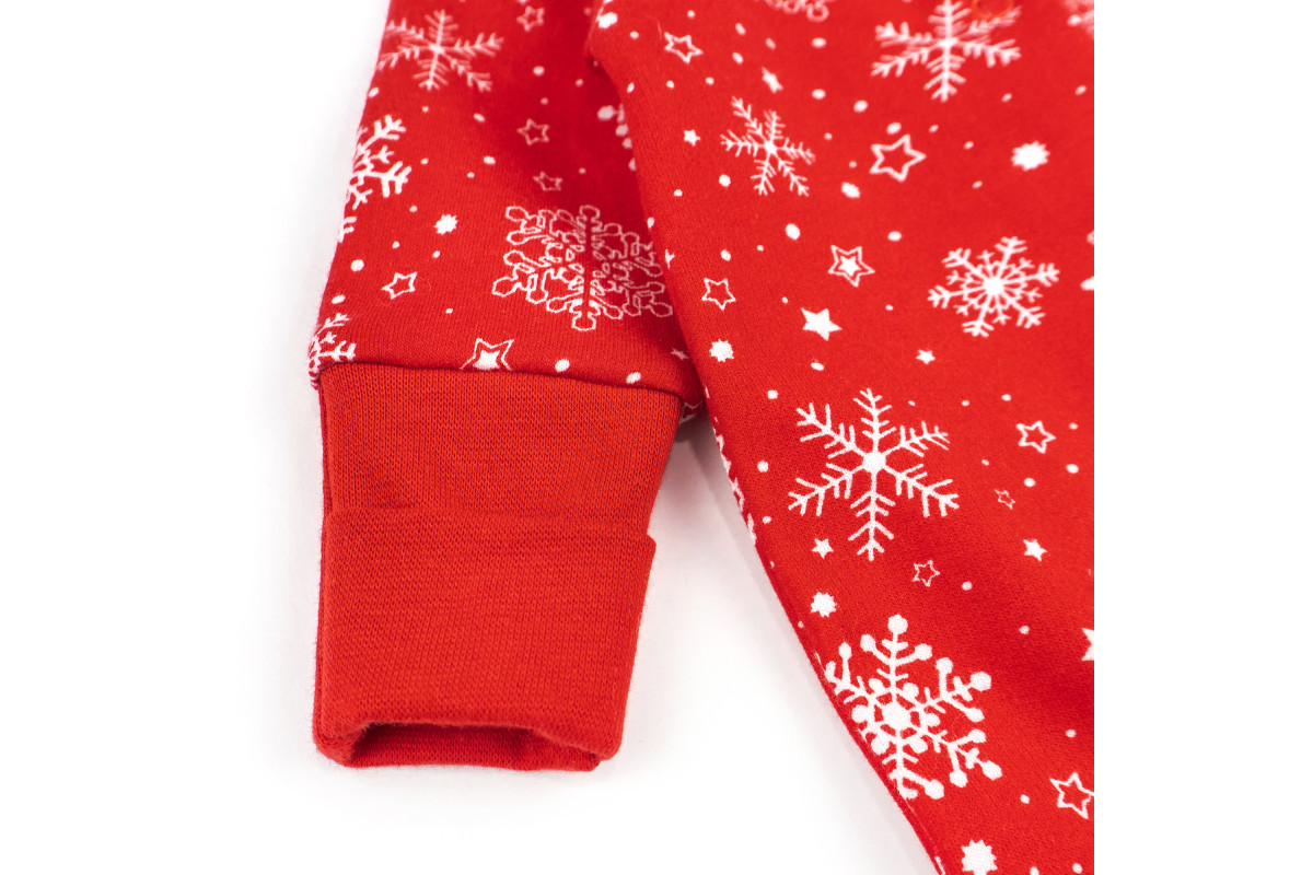 Комбинезон имеет окраску красного цвета со снежинками. Универсальная окраска подойдет и для мальчика, и для девочки.