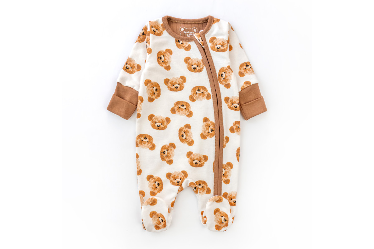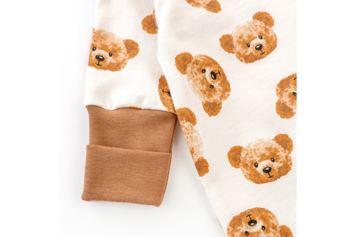 Человек пошит из набивного полотна с мишками на белом фоне.