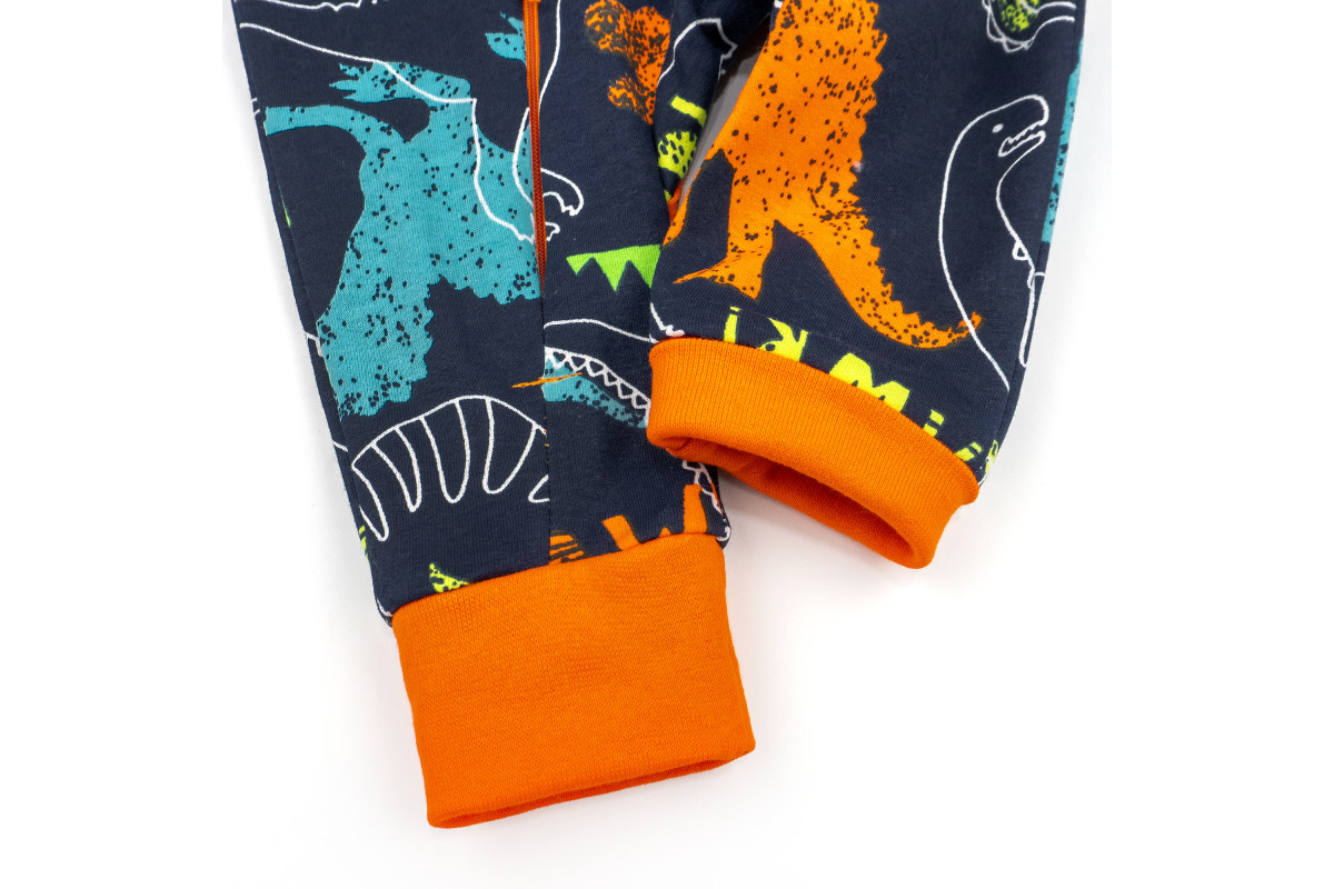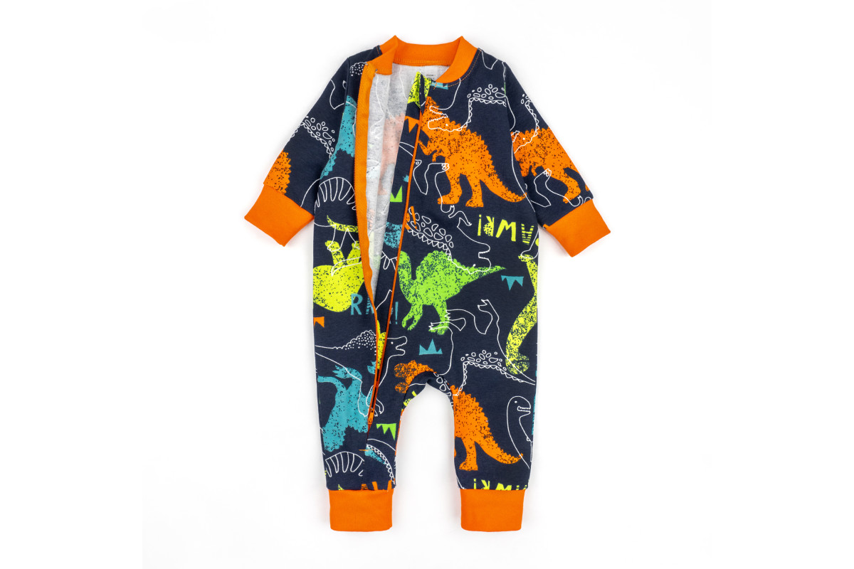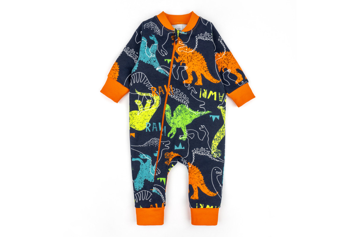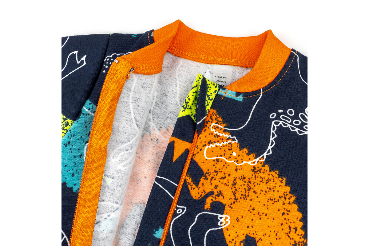 Человечек имеет расцветку темно-синего цвета с яркими неоновыми динозаврами, который подойдет для мальчика.