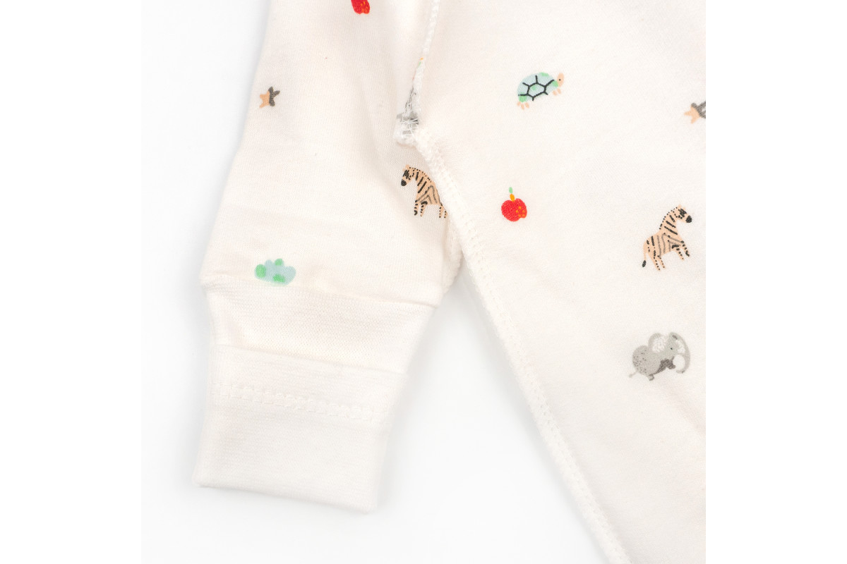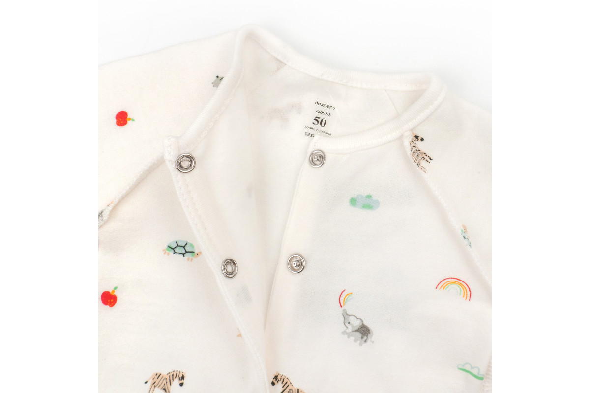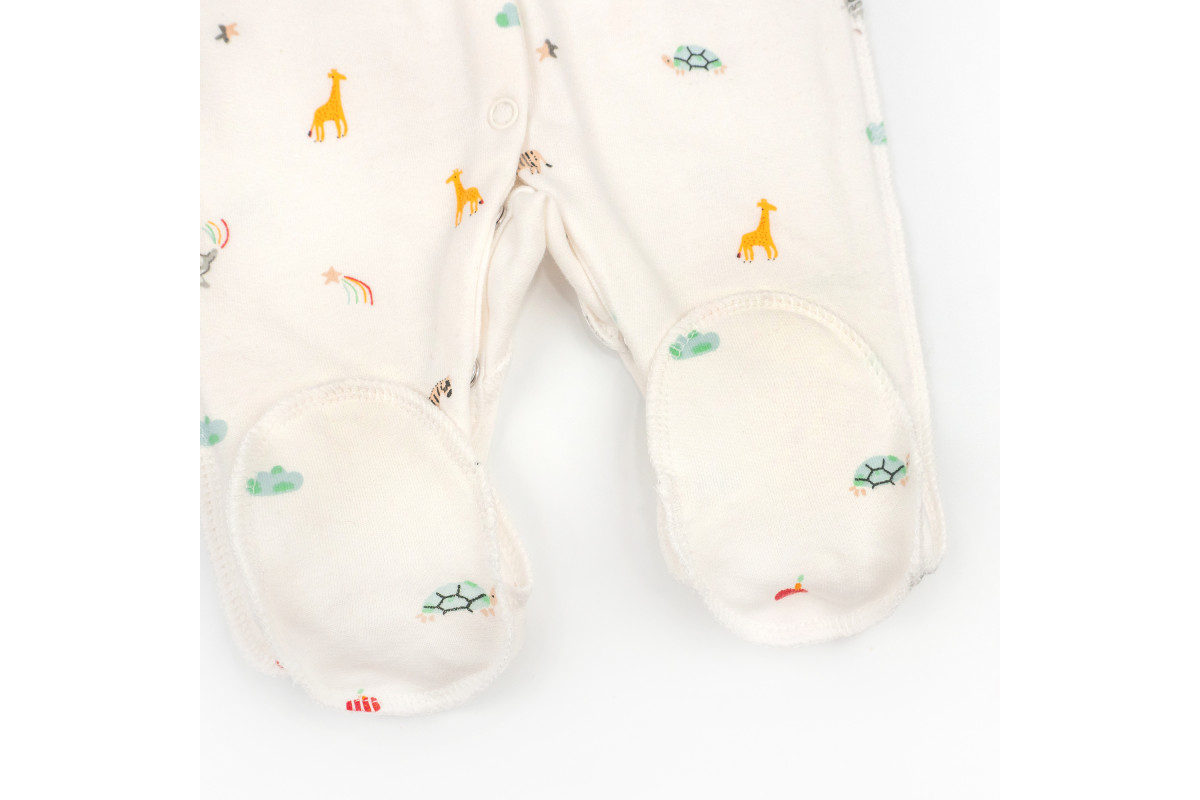 Человечек имеет расцветку молочного цвета со зверятами, которая подойдет для мальчика и для девочки.
