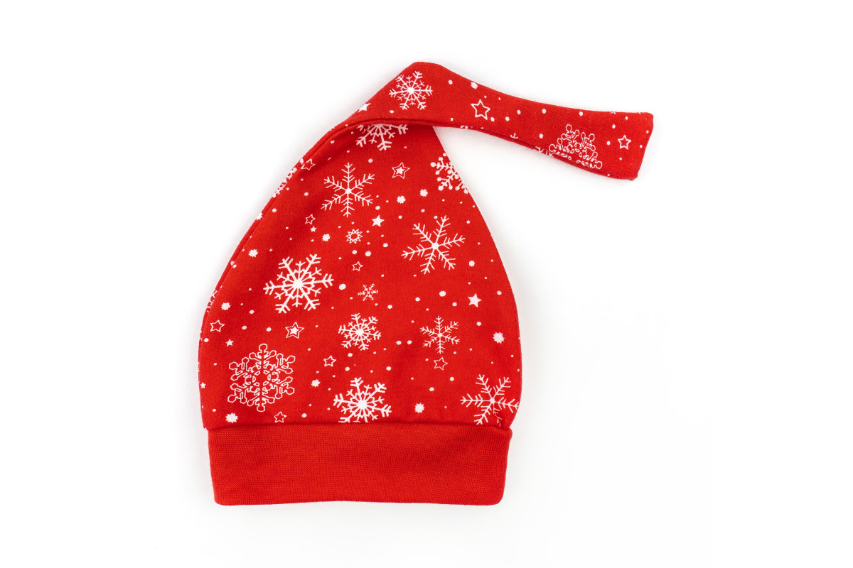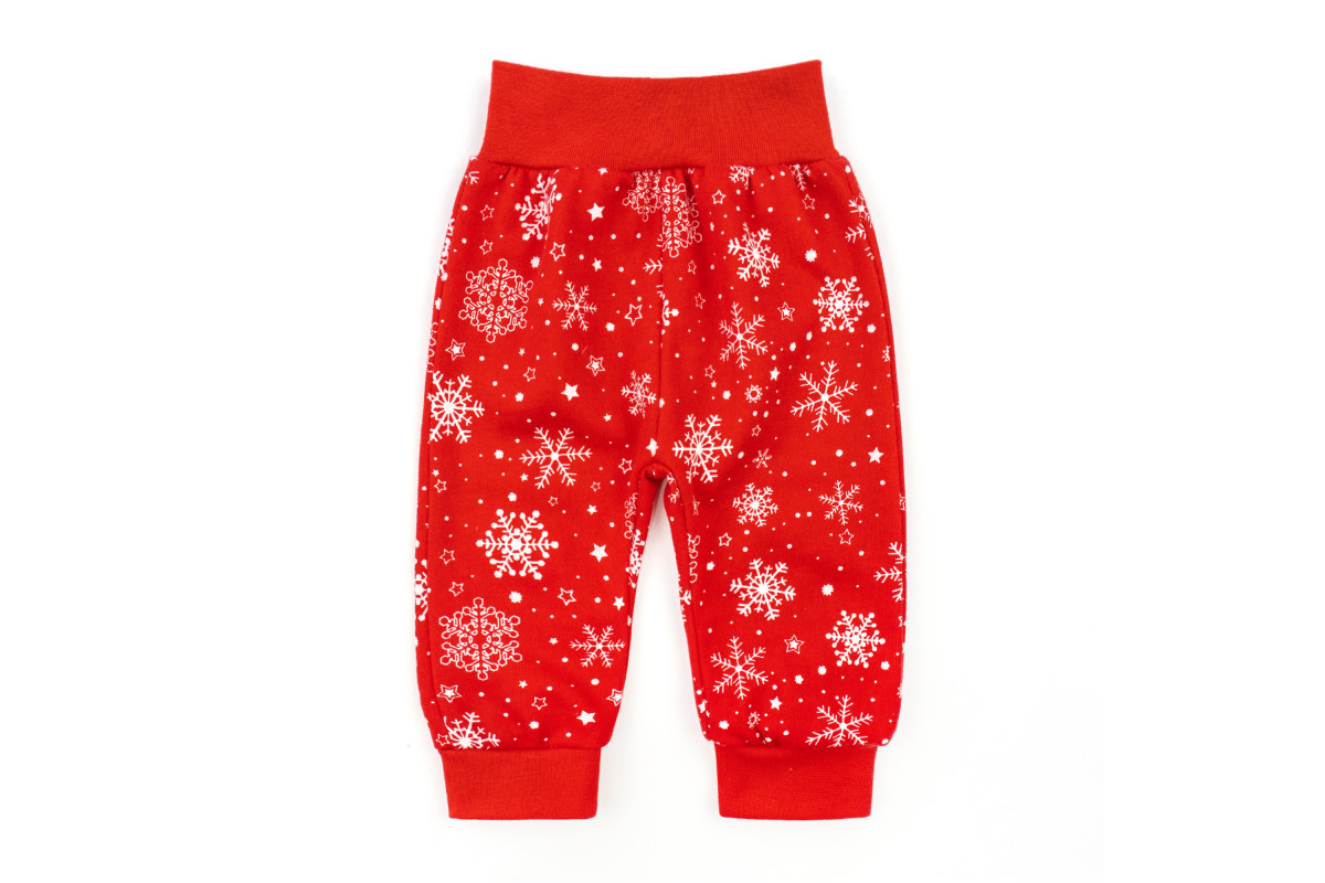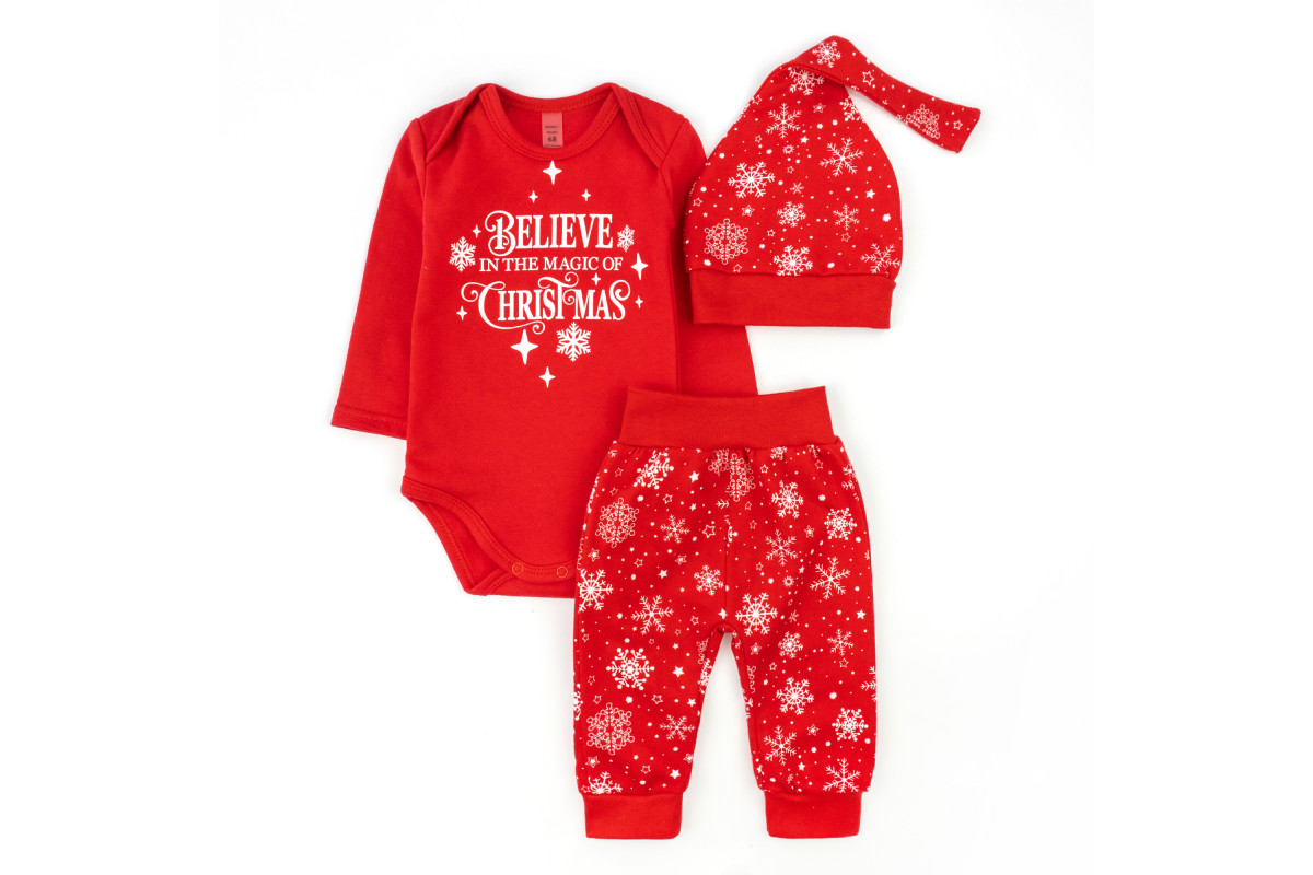 Костюмчик красного цвета с набивкой в виде снежинок на штанишках и шапочке, и принтом на боди.