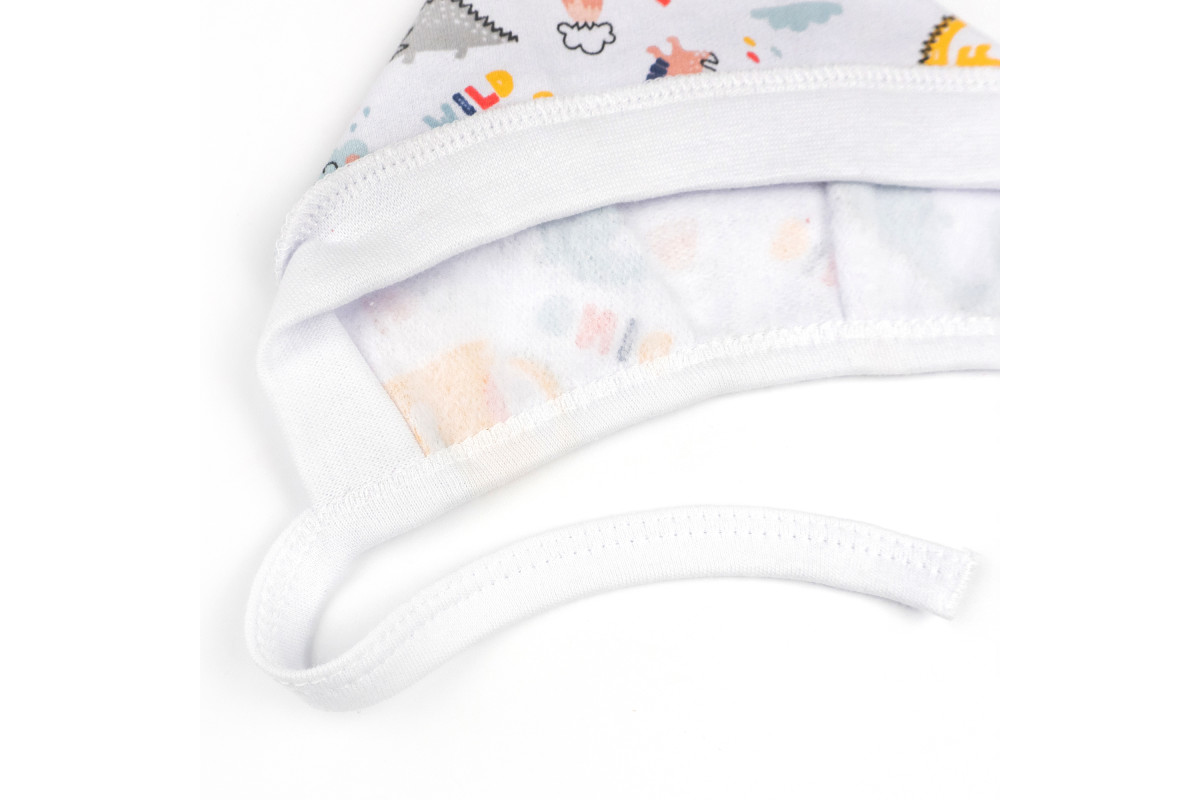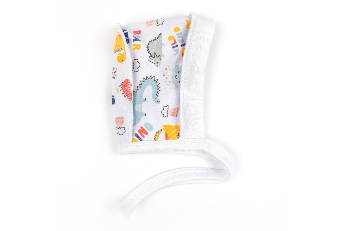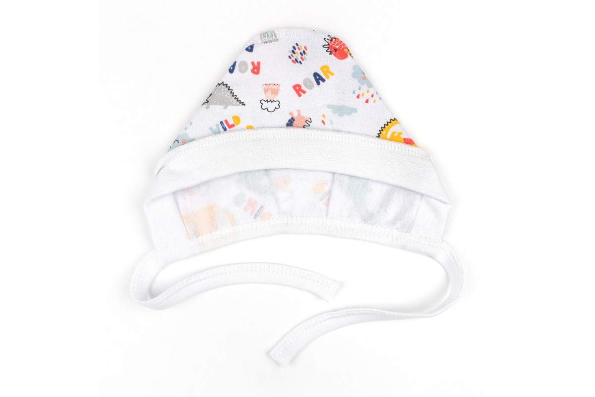 Чепчик имеет расцветку белого цвета с динозаврами, который подойдет для мальчика.