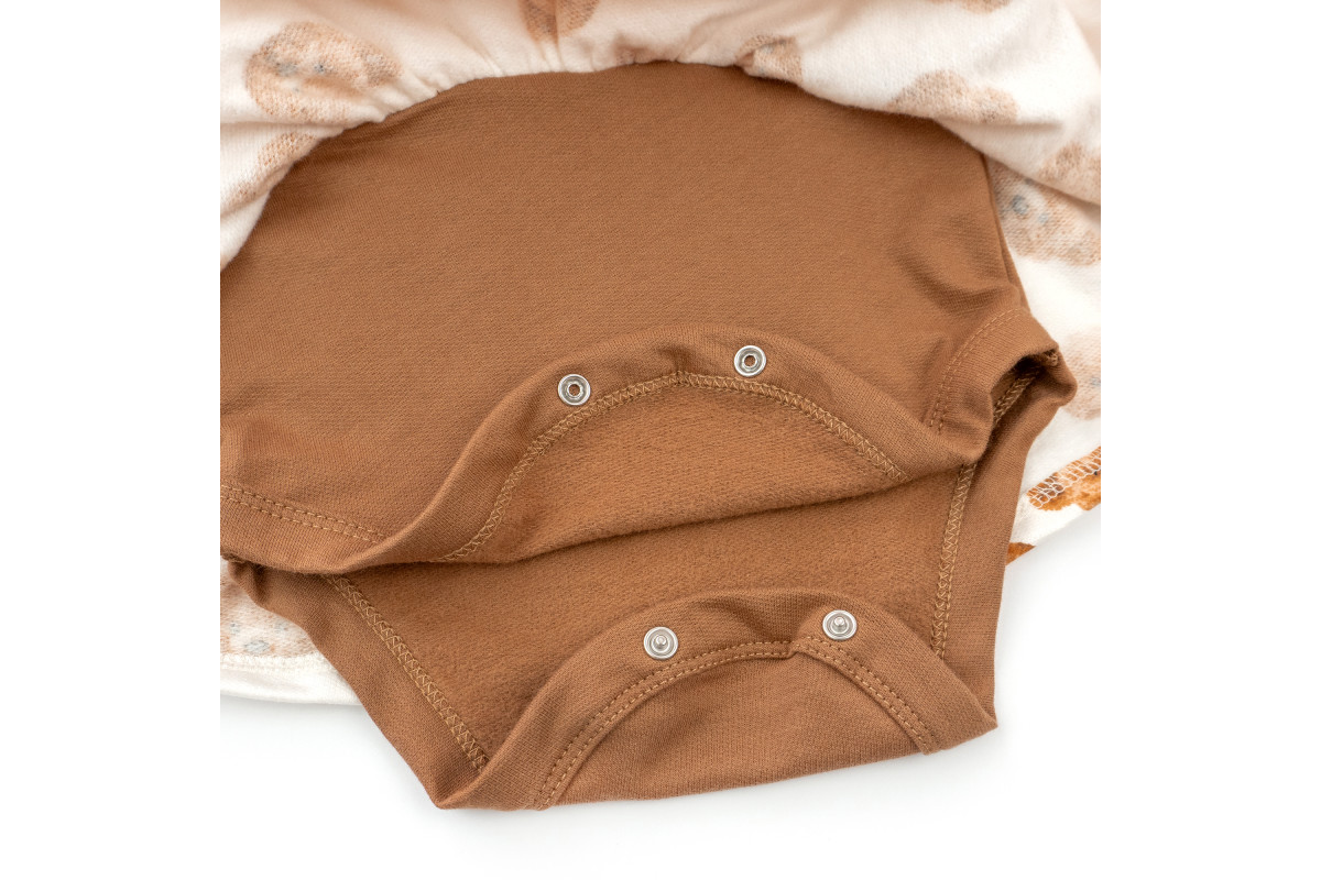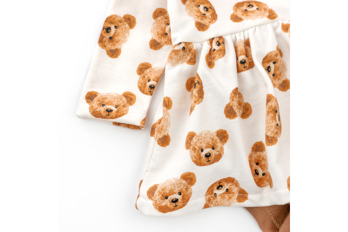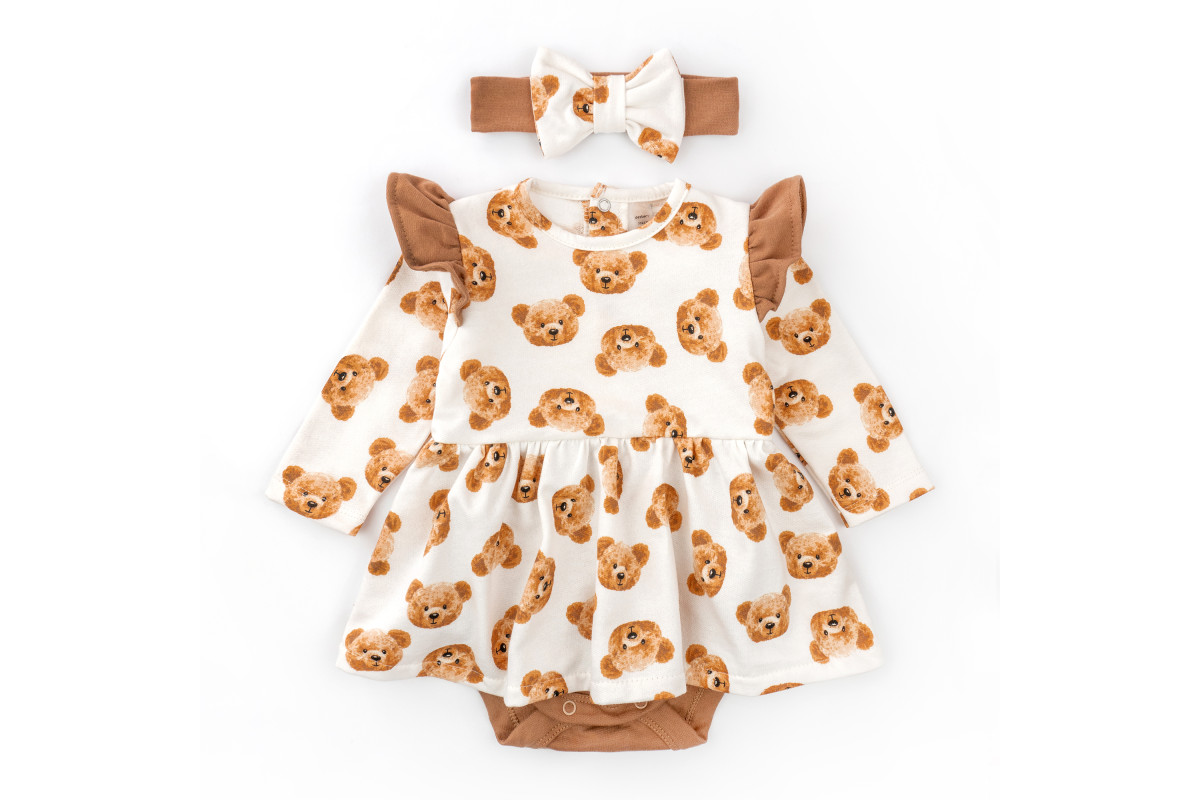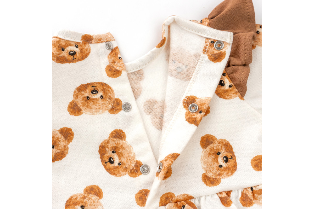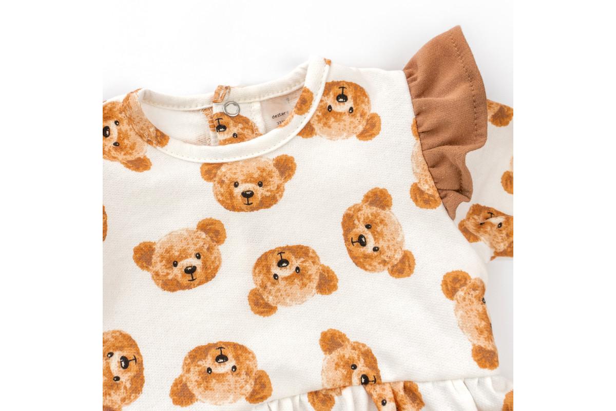 Боди-платье белого цвета в комбинации с коричневыми элементами в цвет мишек с набивного полотна.