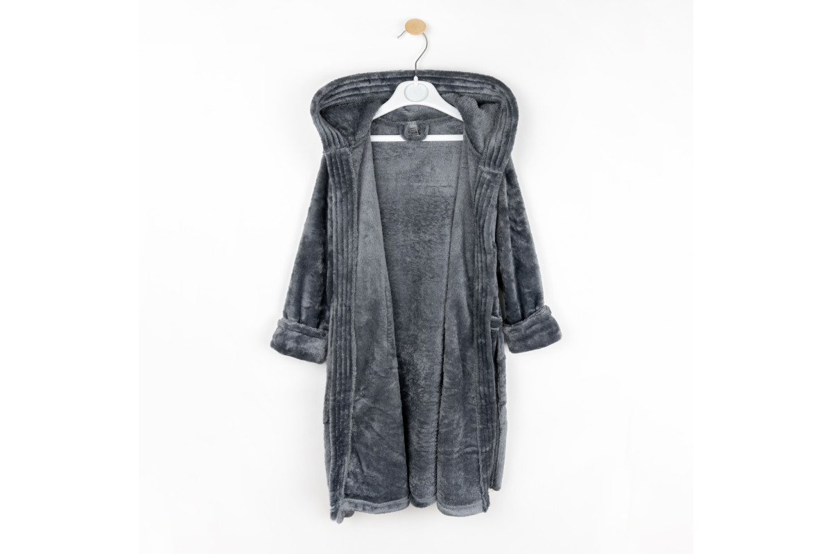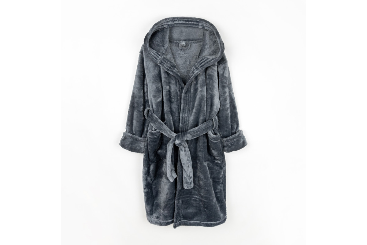 Средняя длина. Идет с капюшоном, карманами, рукава с манжетами. Завязывается с помощью пояса.
