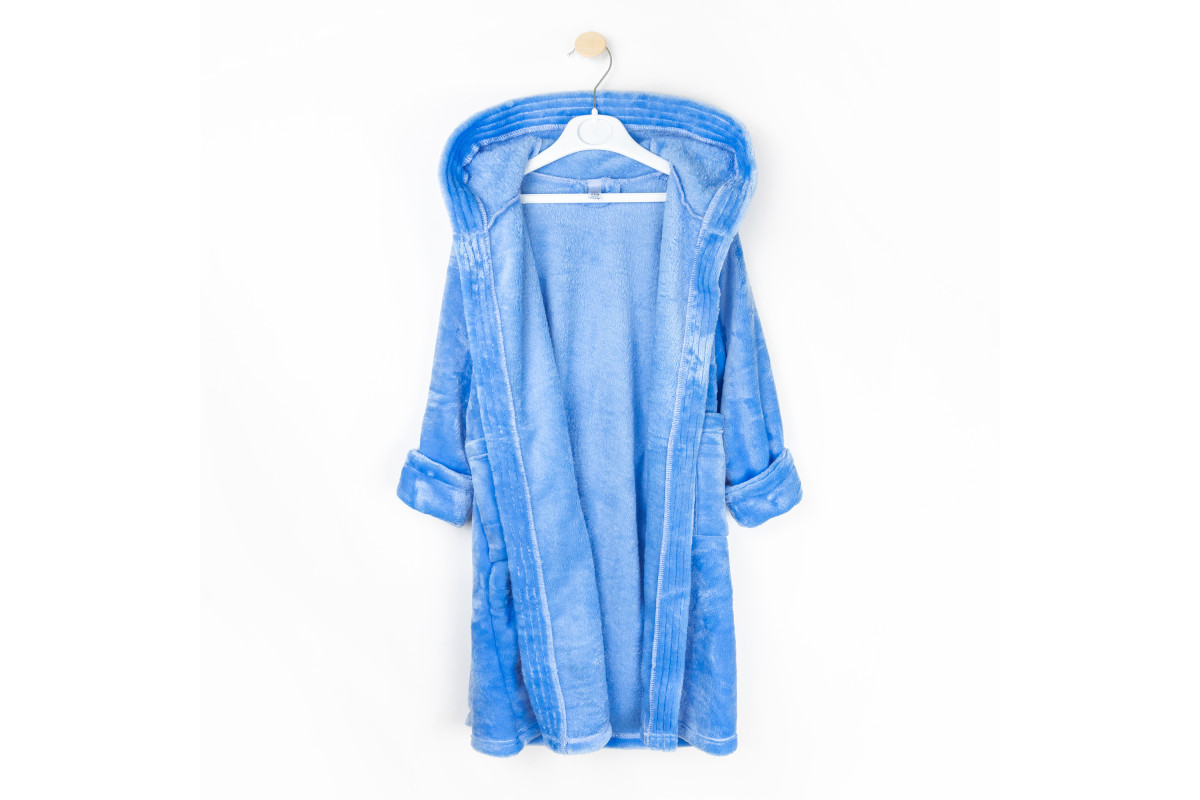 Средняя длина. Идет с капюшоном, карманами, рукава с манжетами. Завязывается с помощью пояса.