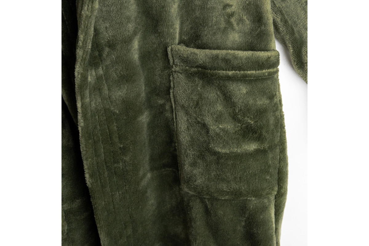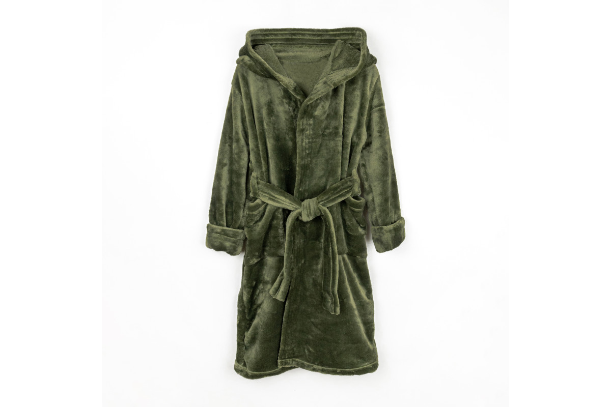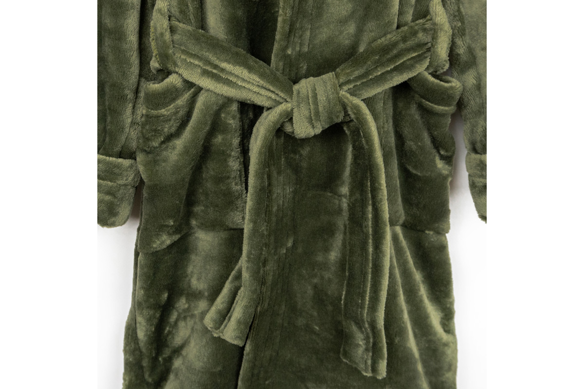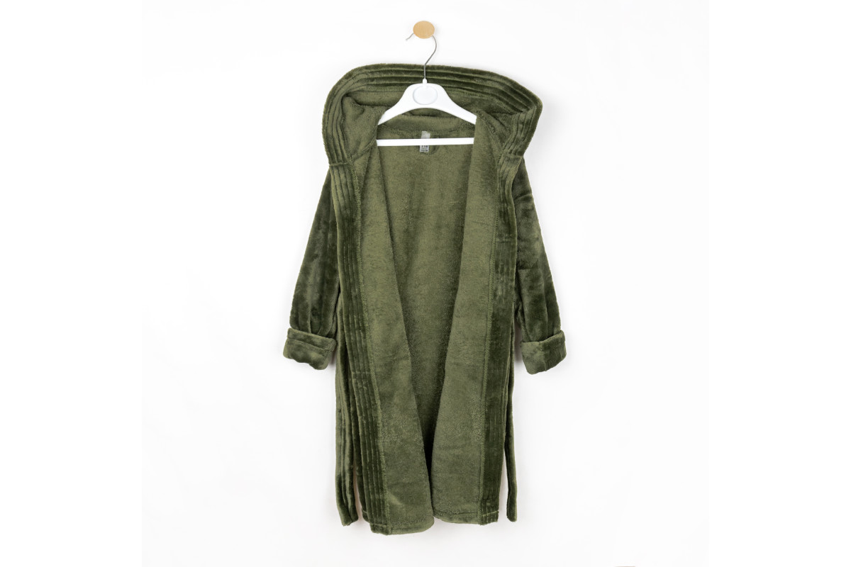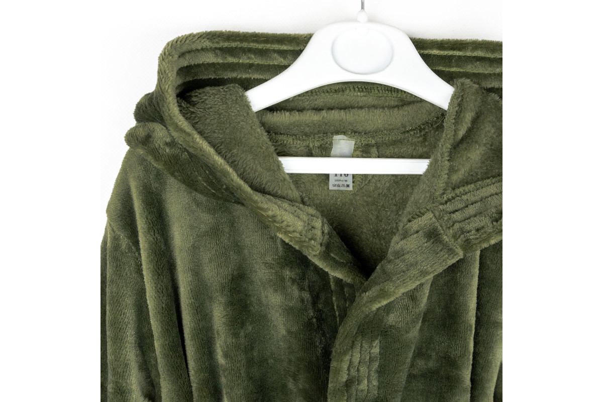 Средняя длина. Идет с капюшоном, карманами, рукава с манжетами. Завязывается с помощью пояса.