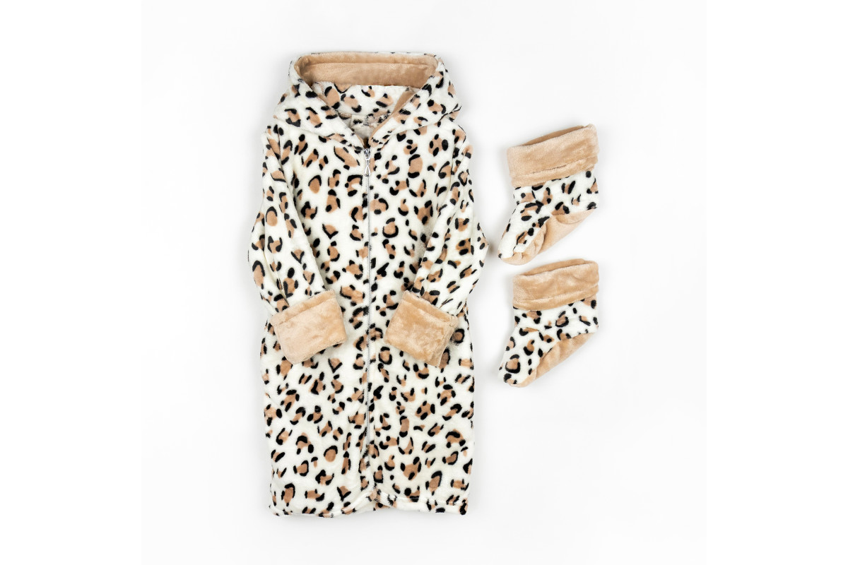 Халат для девочки в комплекте с сапожками в леопардовой расцветке.