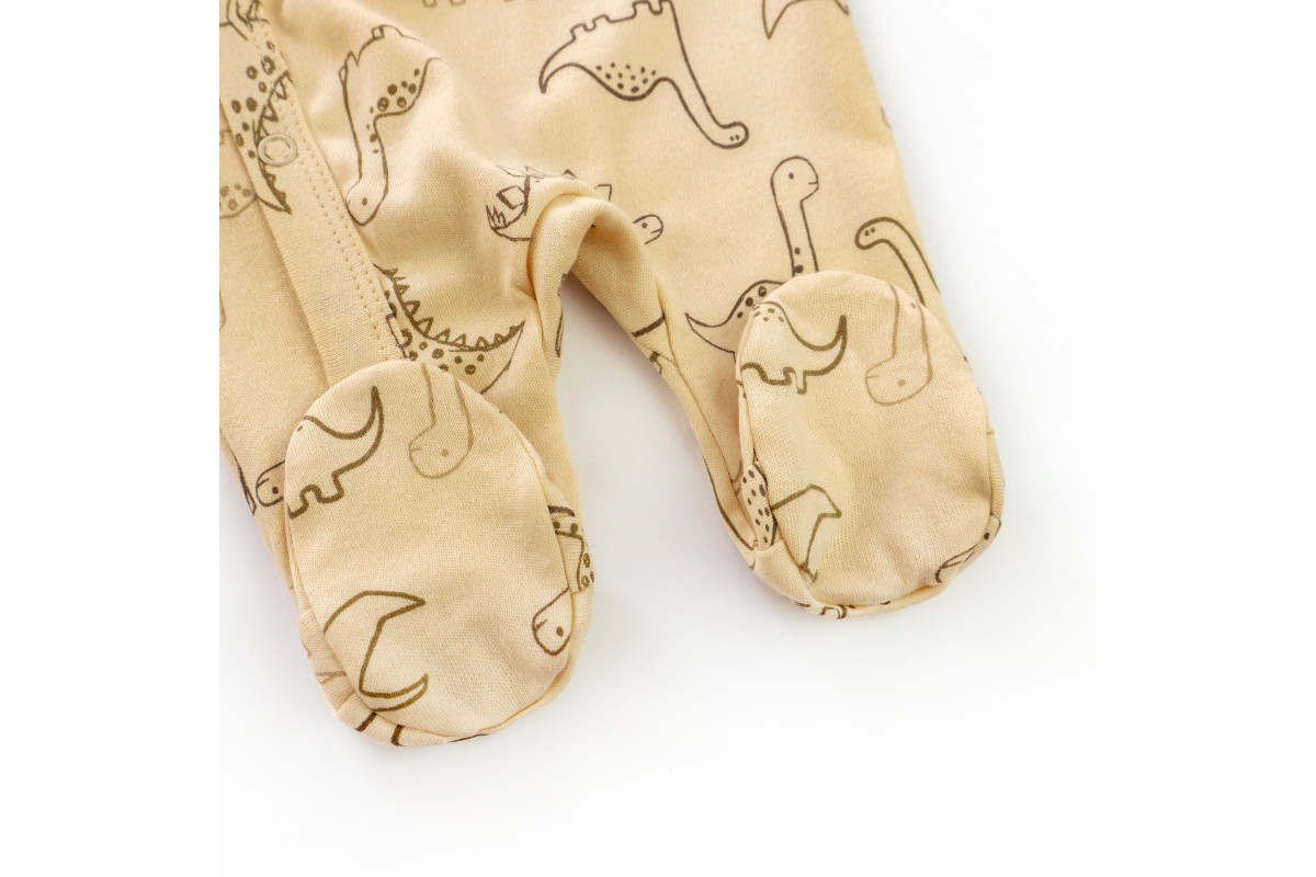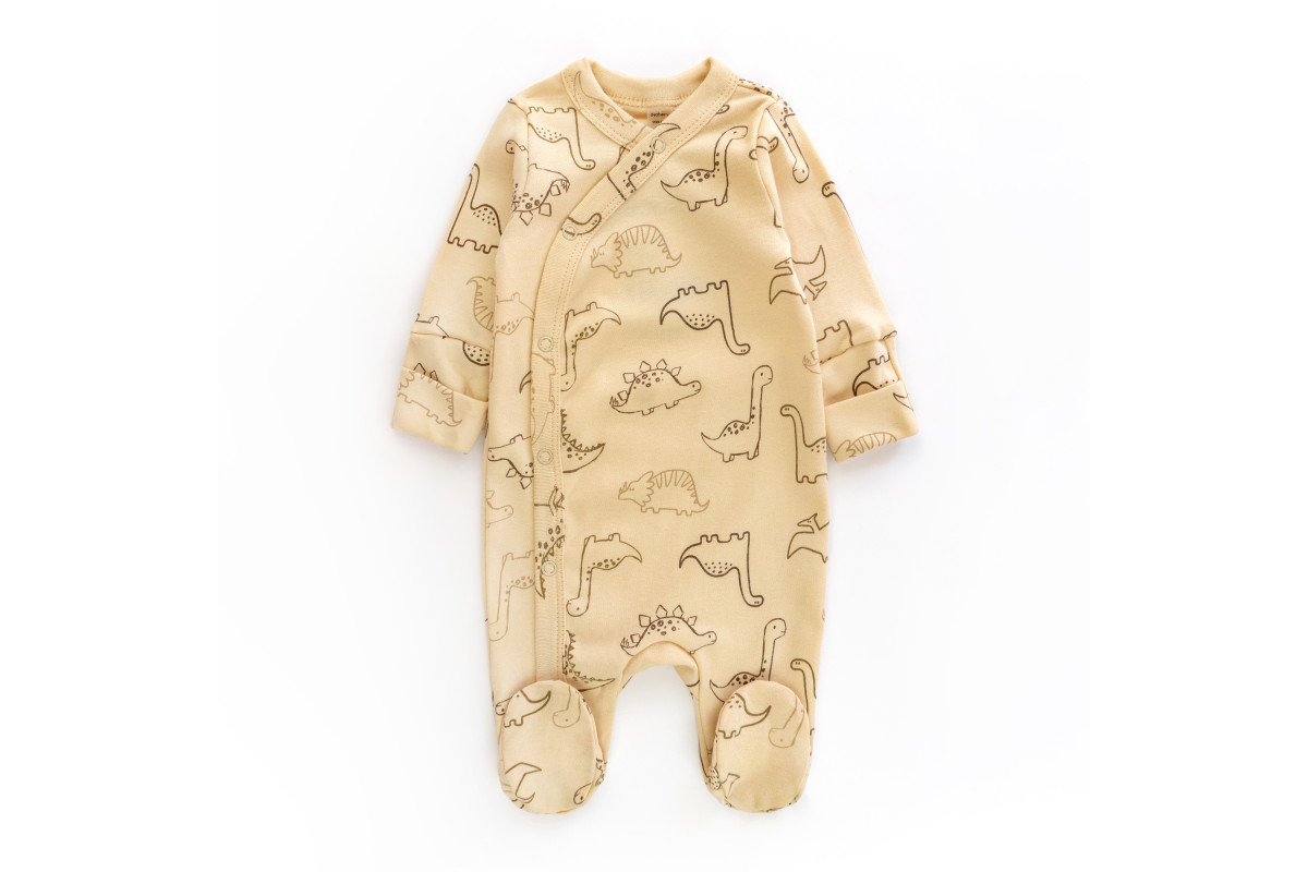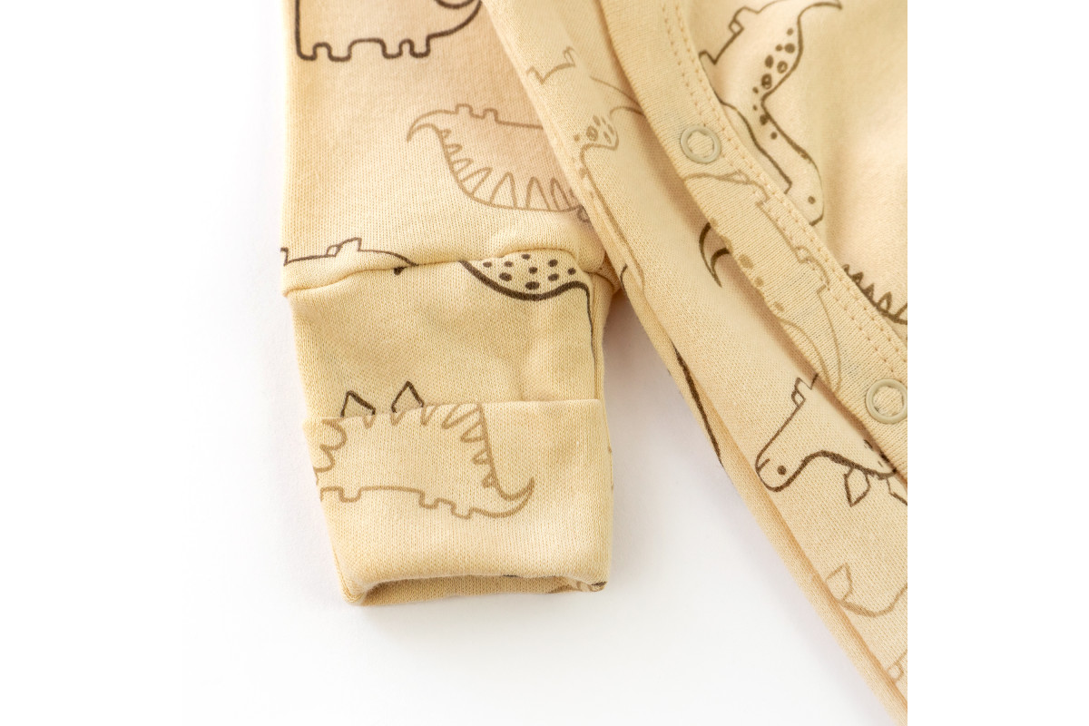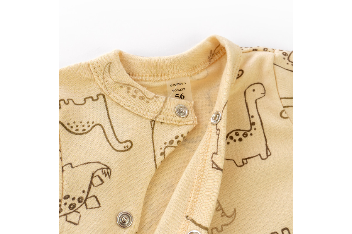 Застежки - кнопки. Ножки закрыты, а рукава имеют мягкие манжеты.