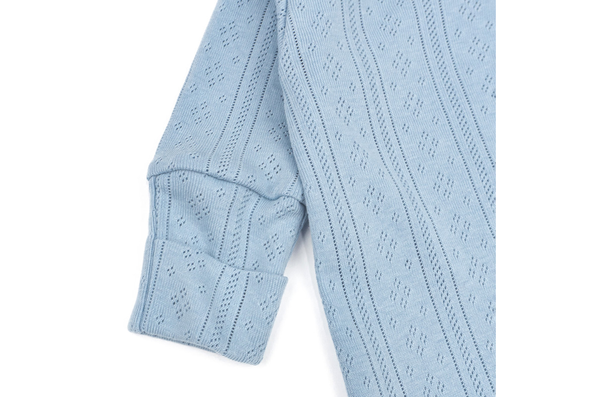 Комбинезон сшит из ткани рибана трансферли – это ткань, которая имеет узор в виде перфорации.