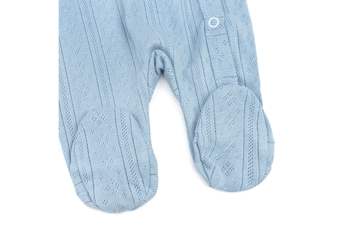 Имеет застежку в виде кнопок по всей длине, рукава-трансформеры, стопы ножек закрыты.