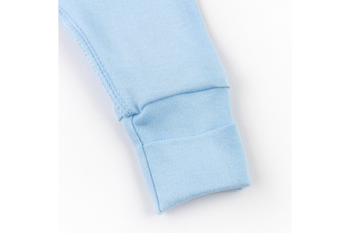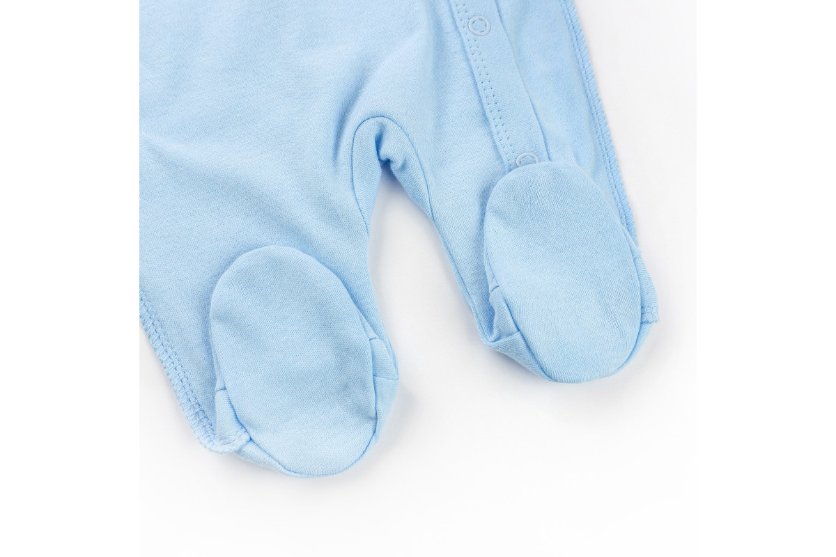 Застежки - кнопки. Ножки закрыты, а рукава имеют мягкие манжеты.