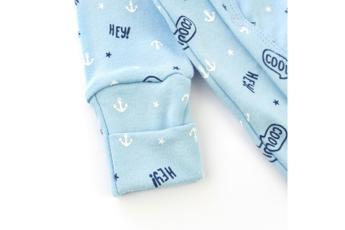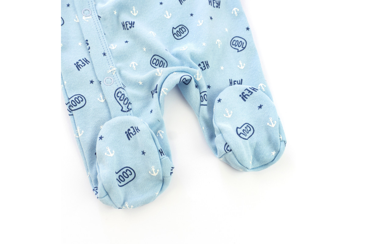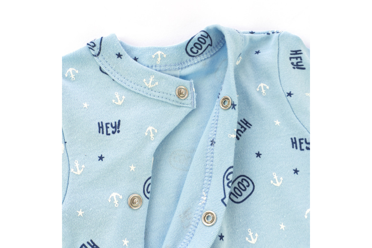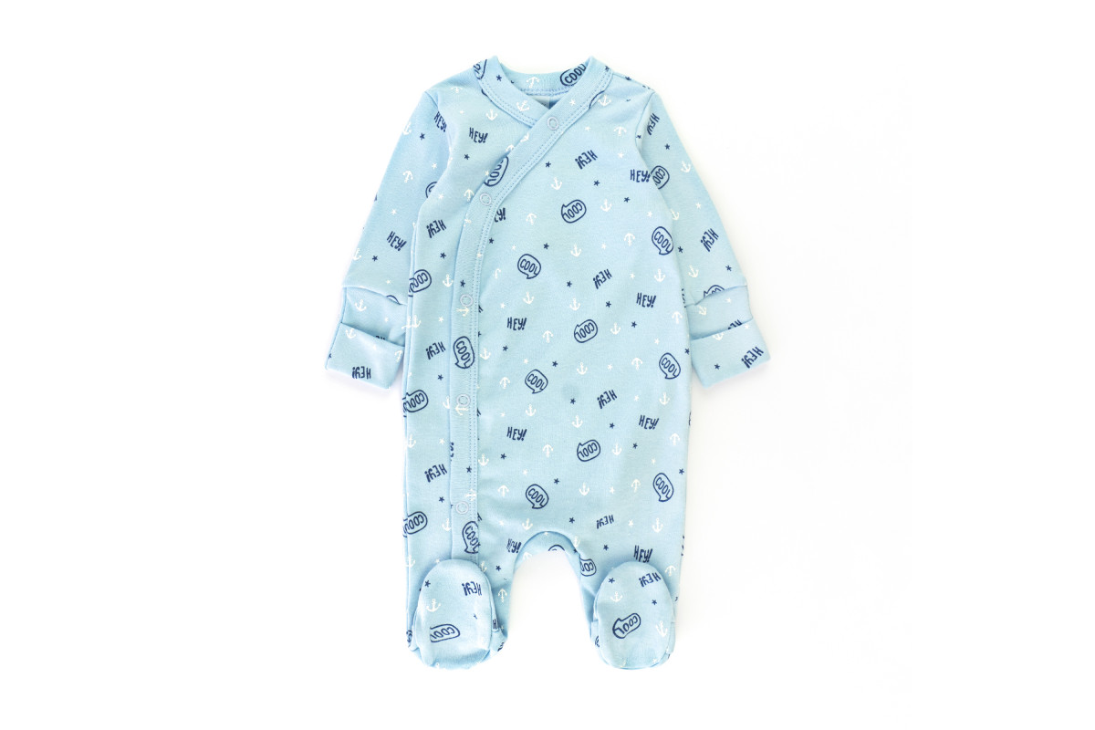 Застежки - кнопки. Ножки закрыты, а рукава имеют мягкие манжеты.