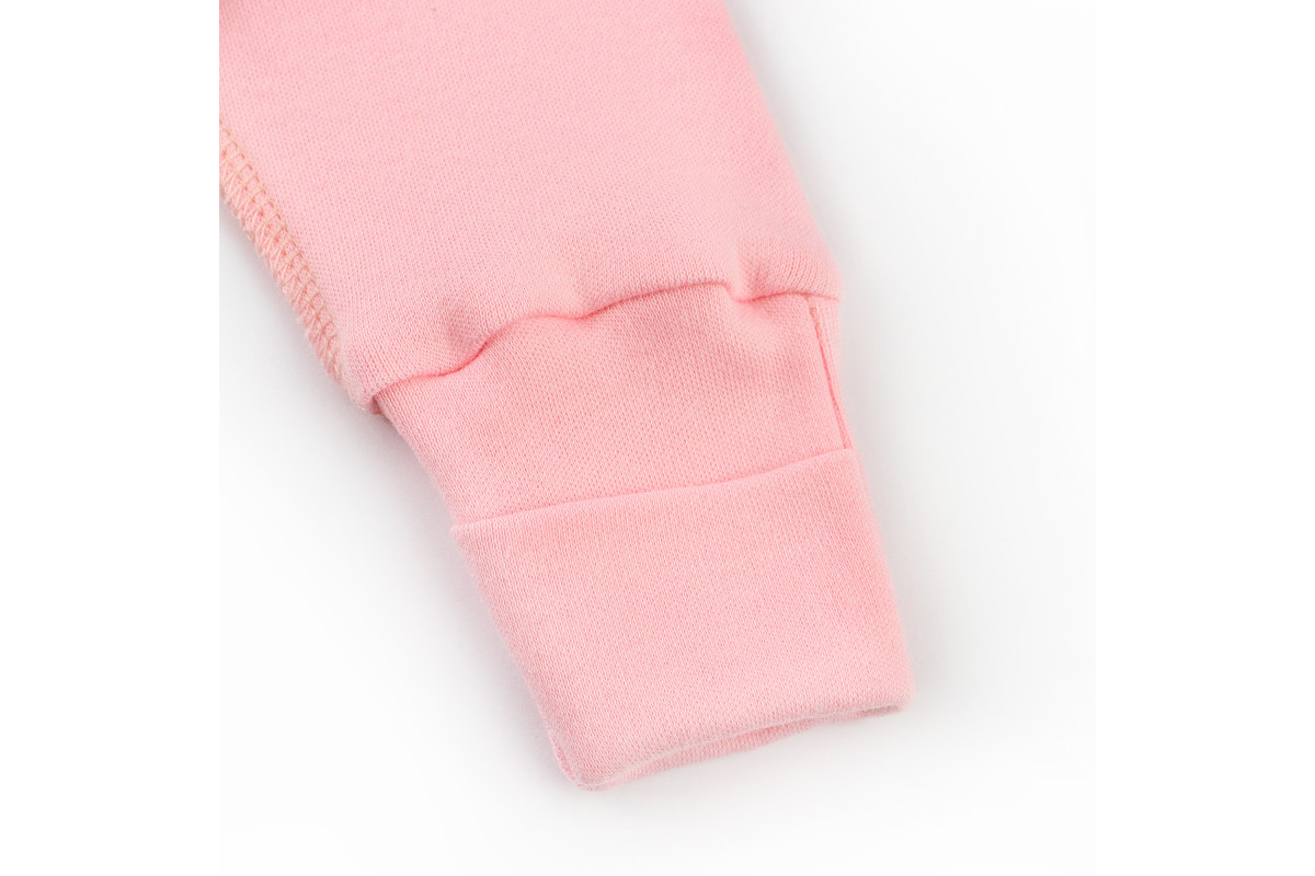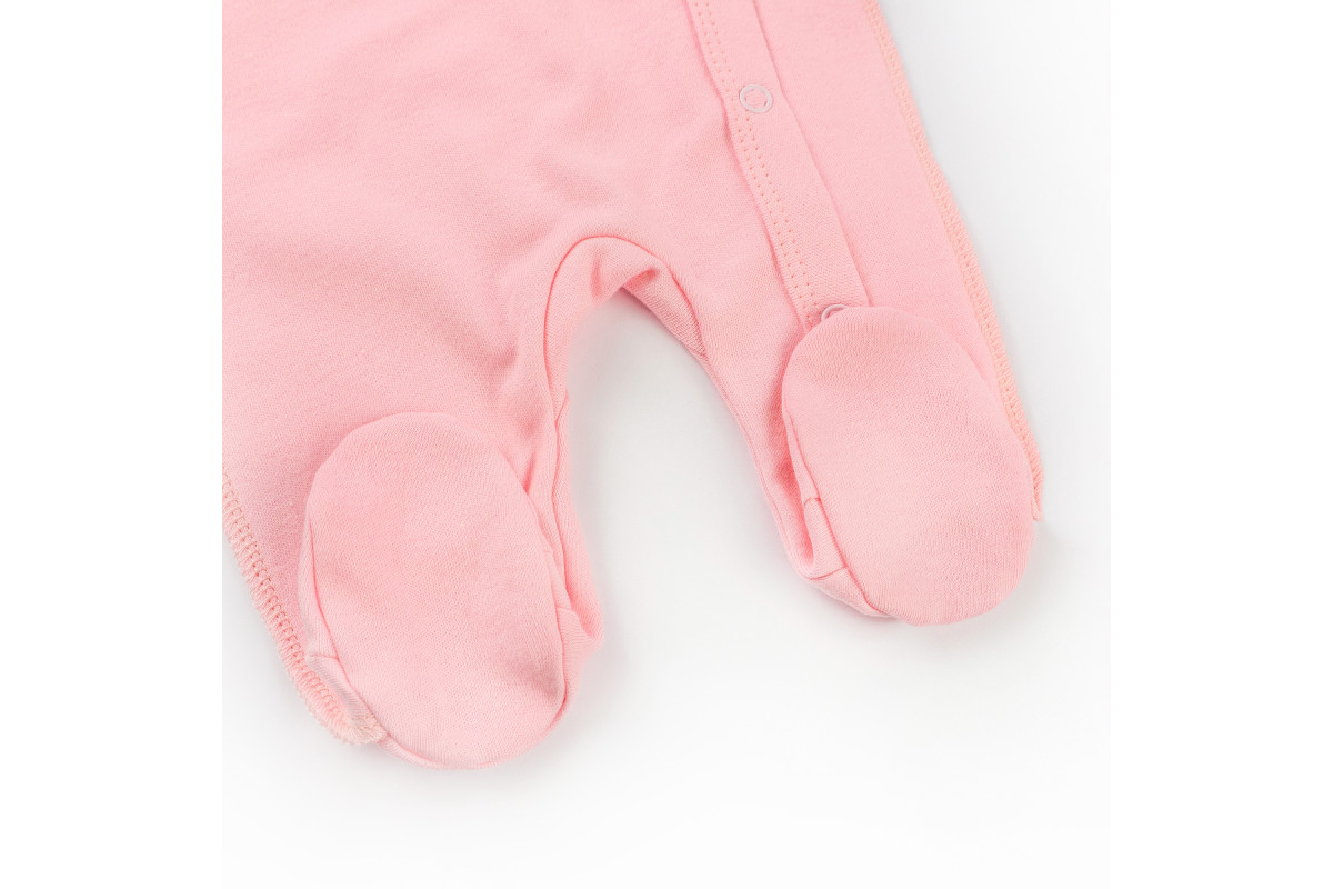 Застежки - кнопки. Ножки закрыты, а рукава имеют мягкие манжеты.