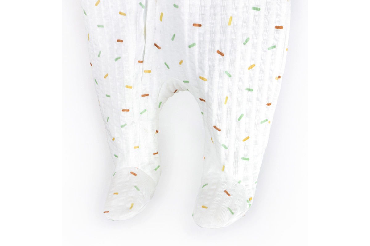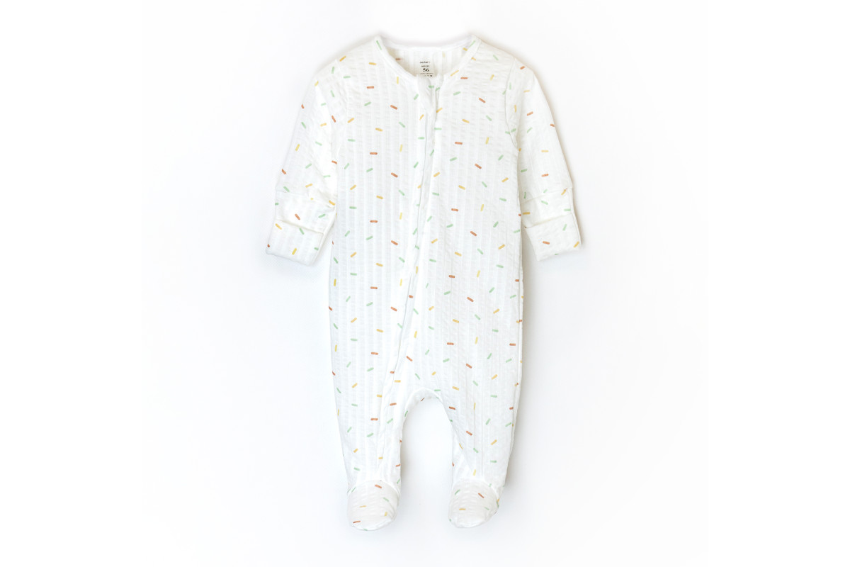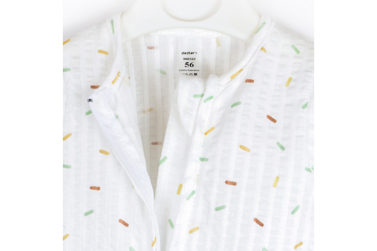 Застежка - молния по диагонали. Ножки закрыты, а рукава имеют мягкие манжеты.