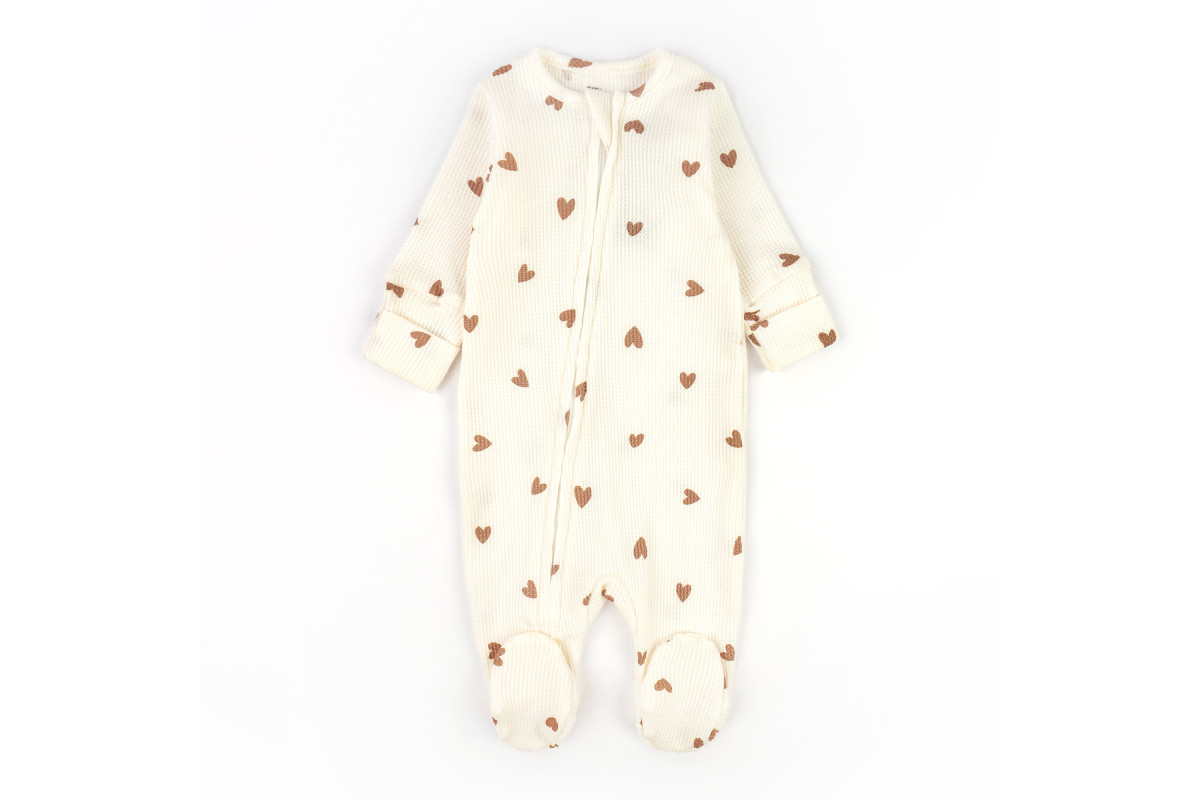 Красивый человечек для младенцев молочного цвета с кофейными сердечками.Застежка - молния по диагона..