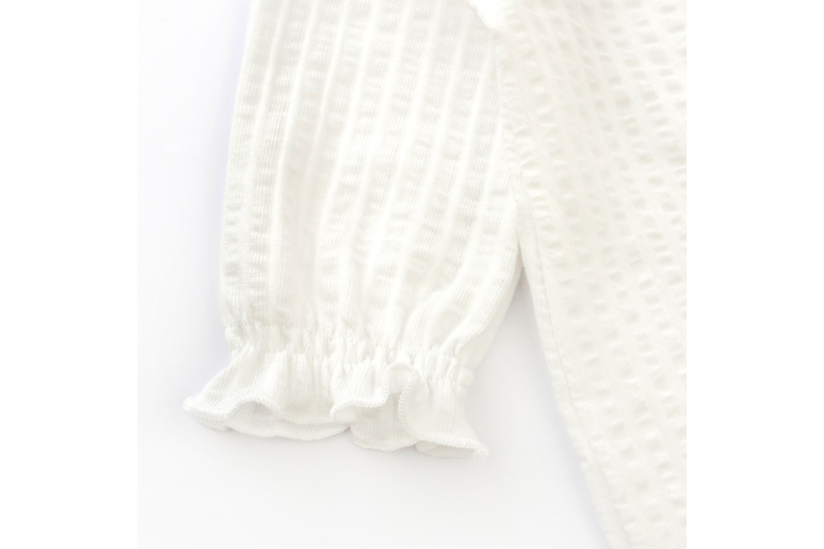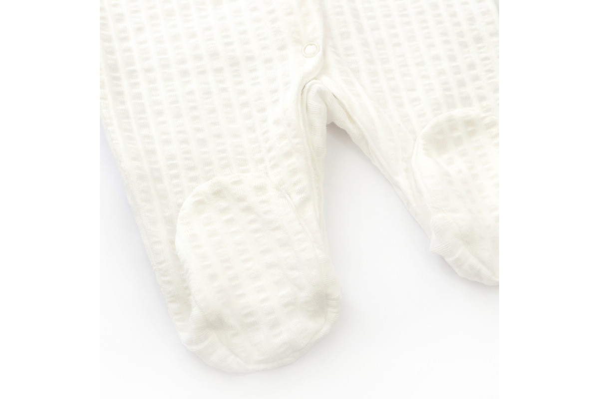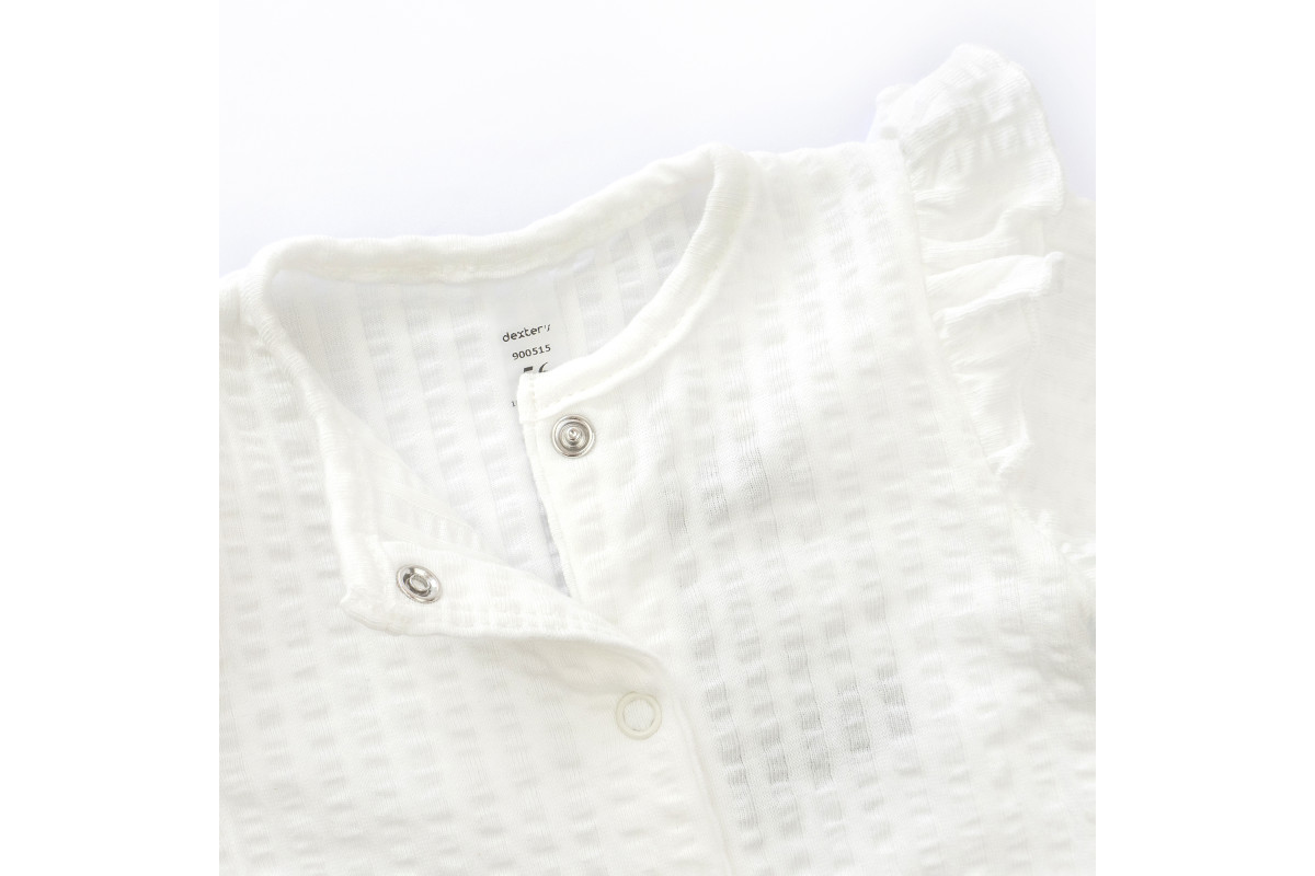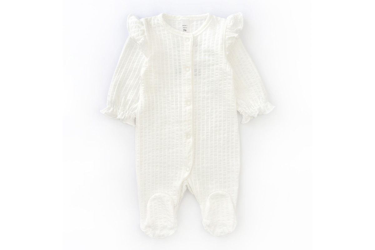 Слип имеет открытые рукавчики со сборкой, закрытые ножки и застежки кнопочки.