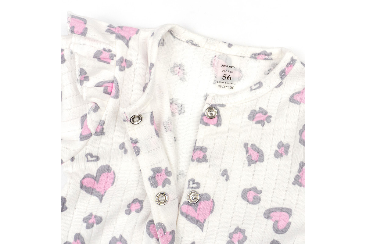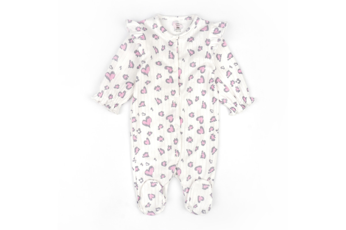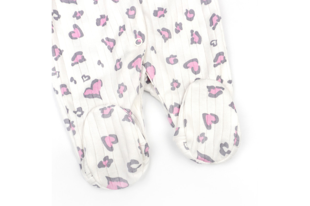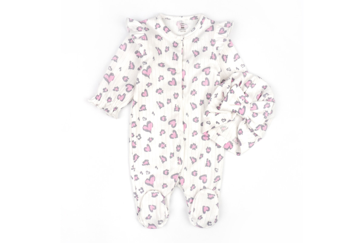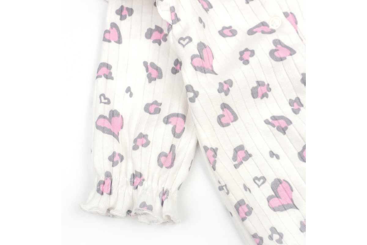 Комбез имеет расцветку молочного цвета с леопардовыми сердечками.