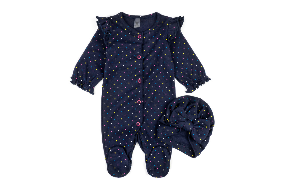 Комбинезон декорирован крылышками и имеет большой рукав. В комплекте есть шапочка с бантом.