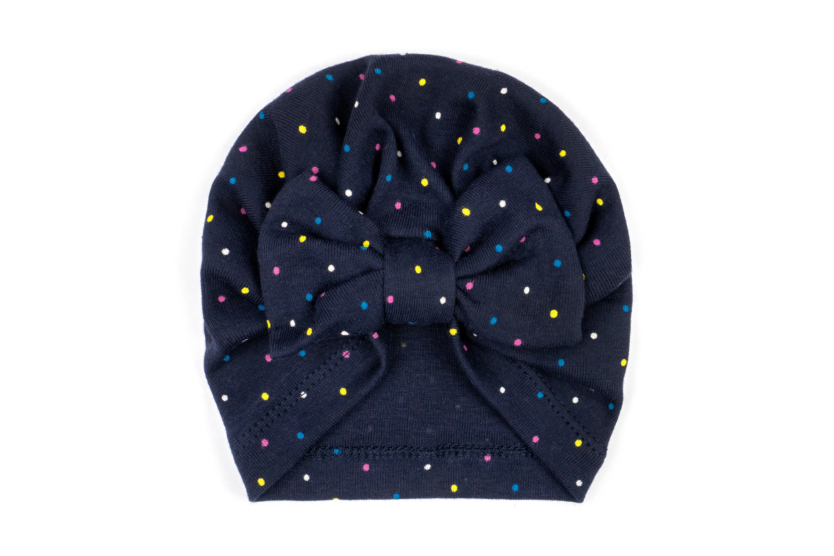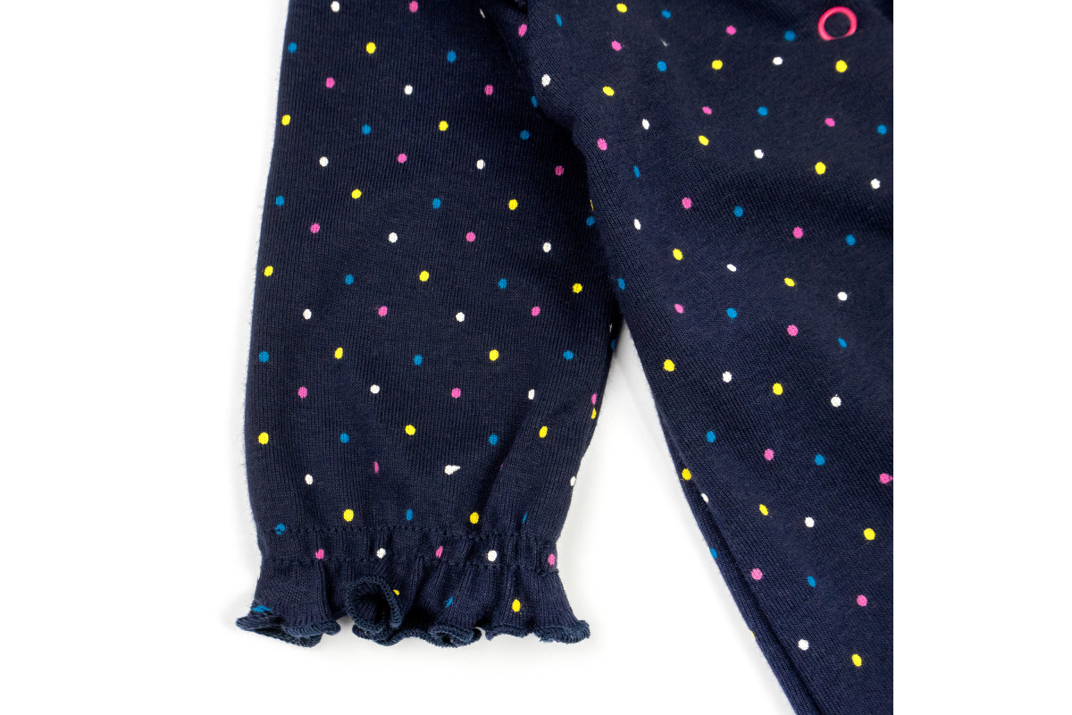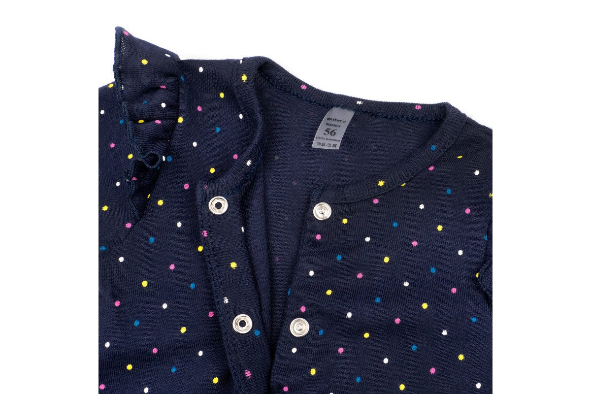 Человечек имеет расцветку темно-синего цвета в разноцветный горошек.
