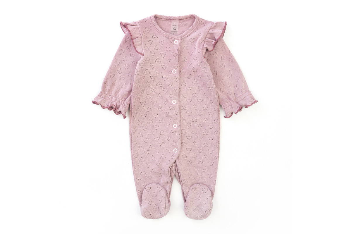 Слип имеет открытые рукавчики со сборкой, закрытые ножки и застежки кнопочки.