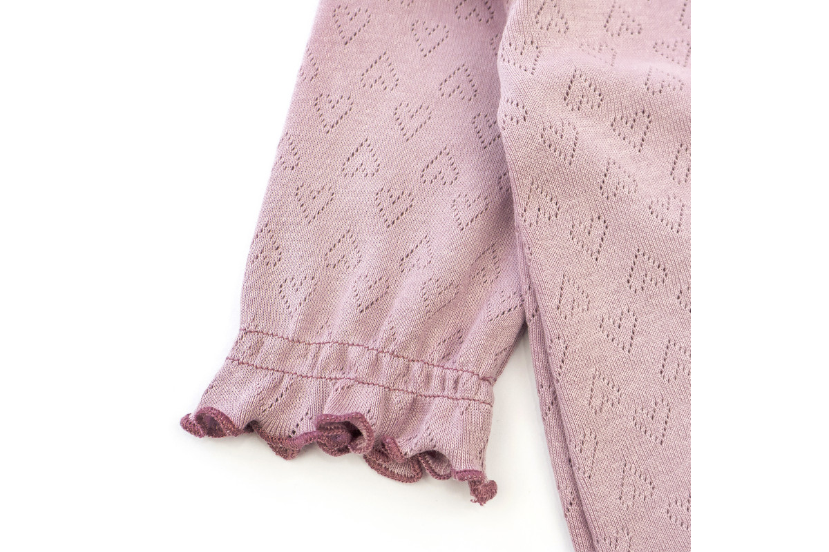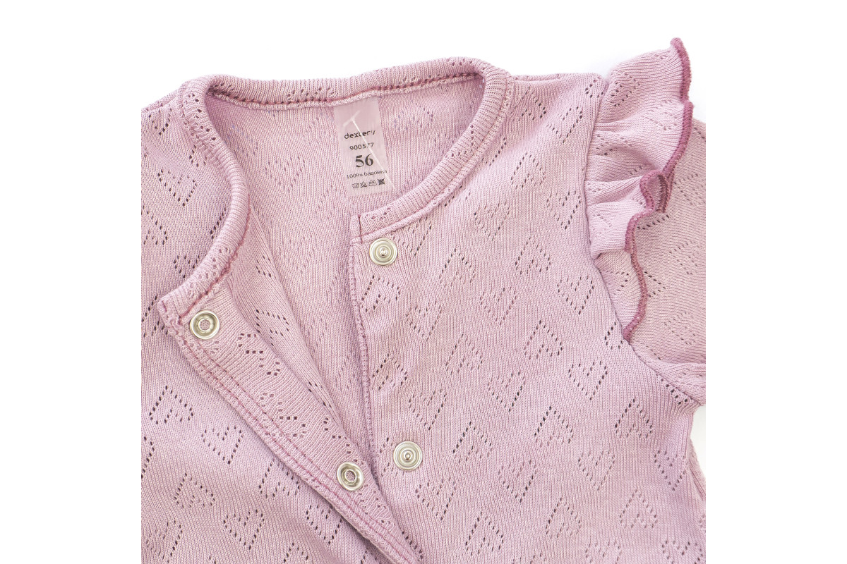 Изготовлен из рибаны трансферли - ткань с перфорацией в виде сердечек, что выглядит очень мило.