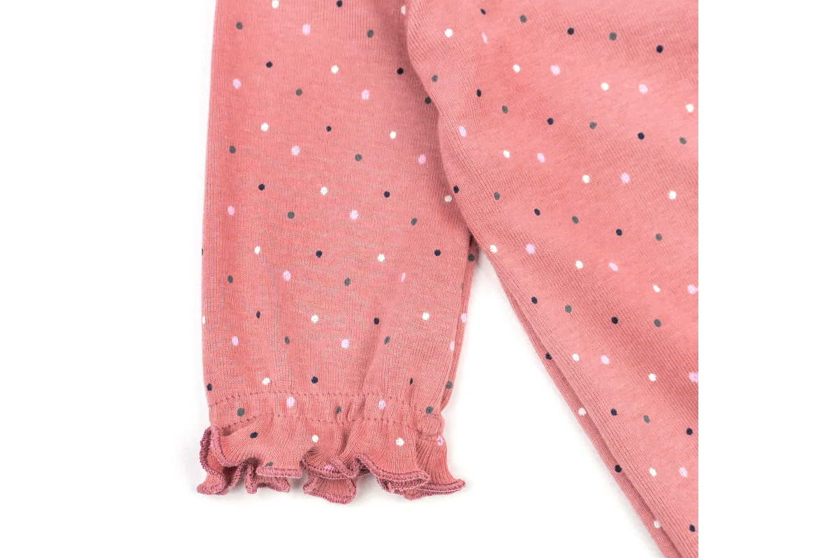 Имеет расцветку розового цвета в разноцветный горошек.