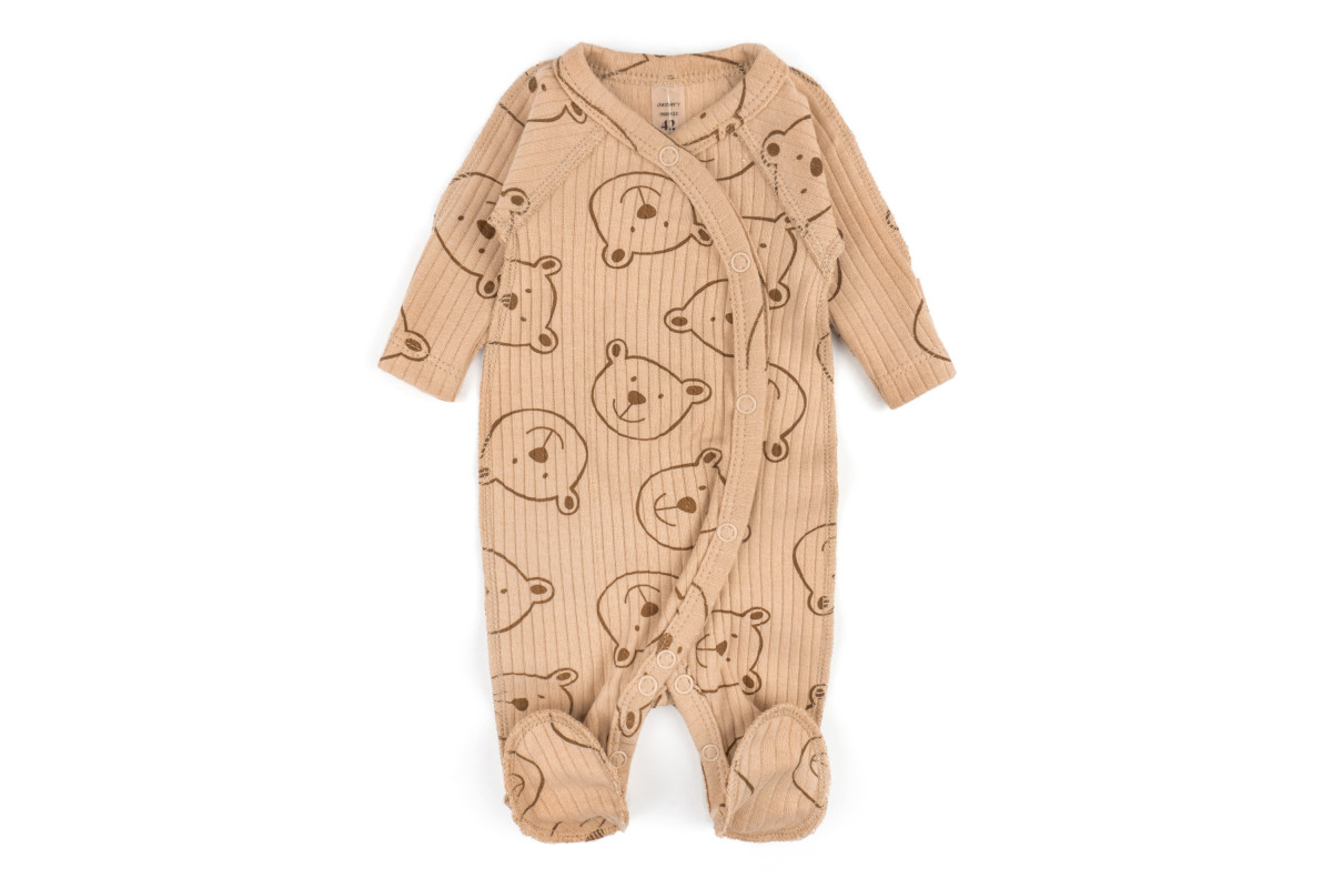 Человечек имеет расцветку коричневого цвета с мишками, который подойдет для мальчика и для девочки.