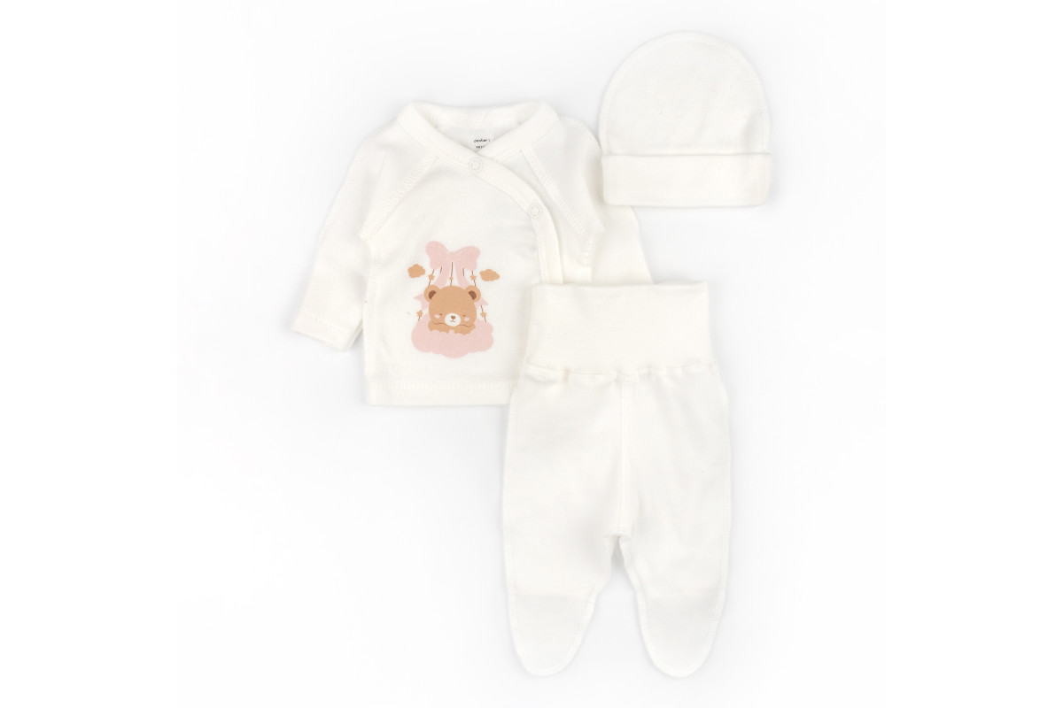 Комплект для новорожденных из интерлока.Костюм состоит из:- распашонки с принтом мишки, которая заст..