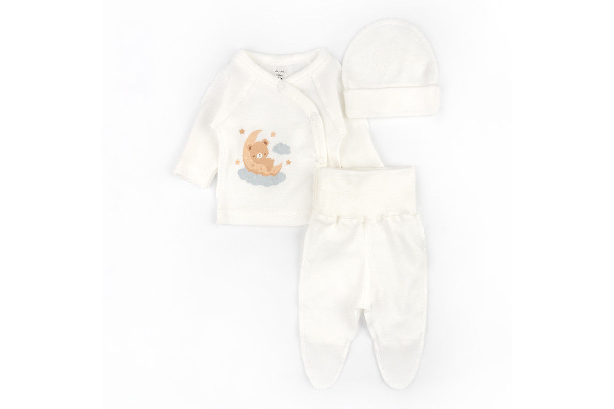 Набор молочного цвета с принтом мишки. Такая расцветка подойдет и для мальчика, и для девочки.