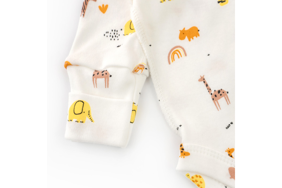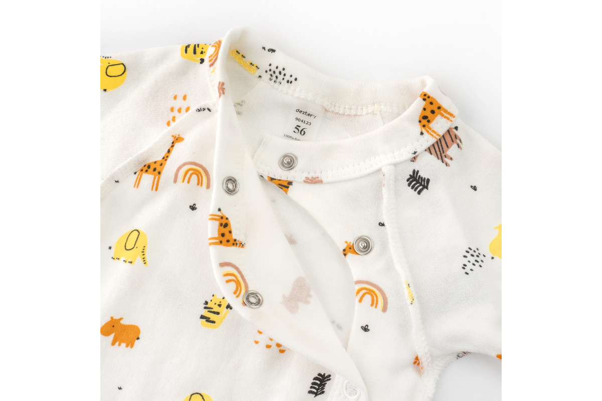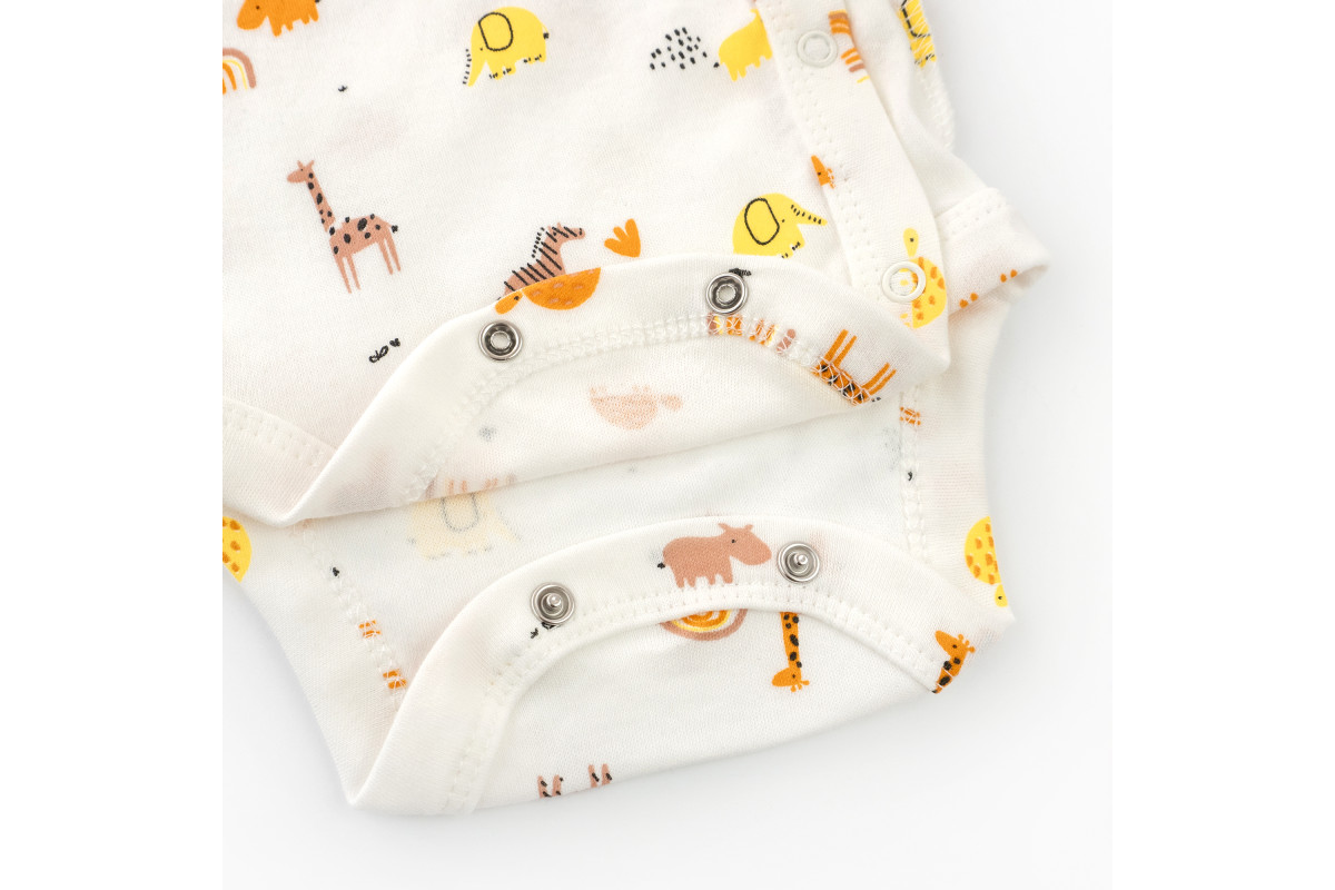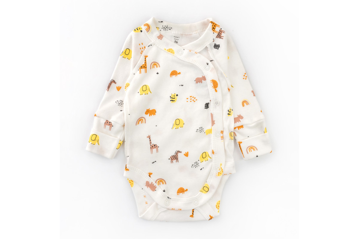 Боди для новорожденных молочного цвета с ярким изображением животных.