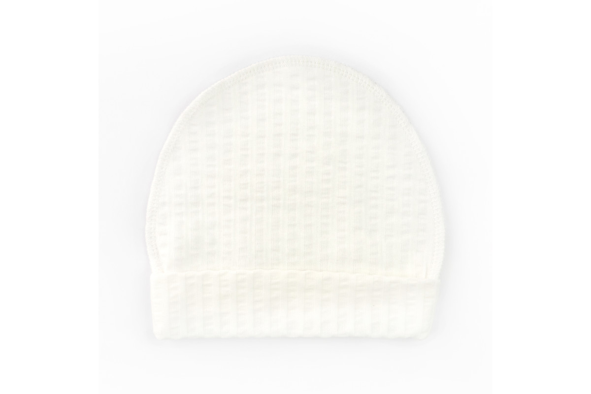 Пошита из ткани интерлок жатка. Материал изделия имеет текстуру, которая делает шапочку более интересной и стильной.