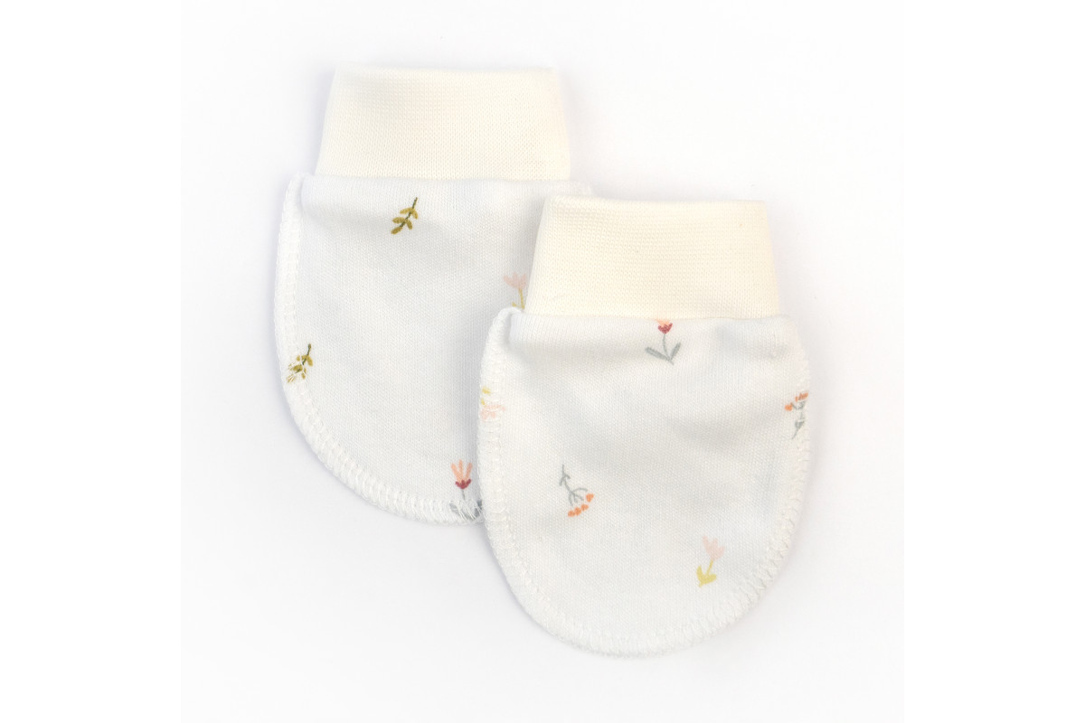 Нежные царапки для новорожденных белого цвета в мелкие цветочки.
