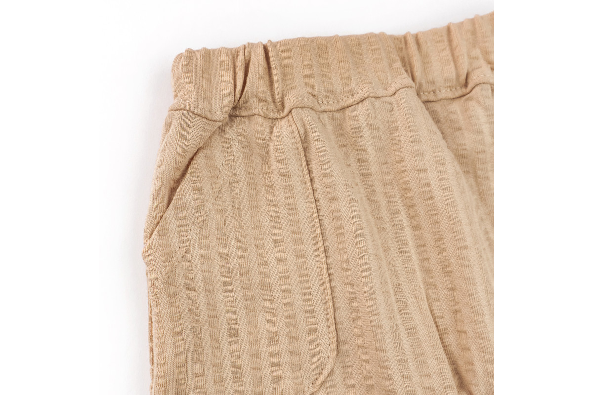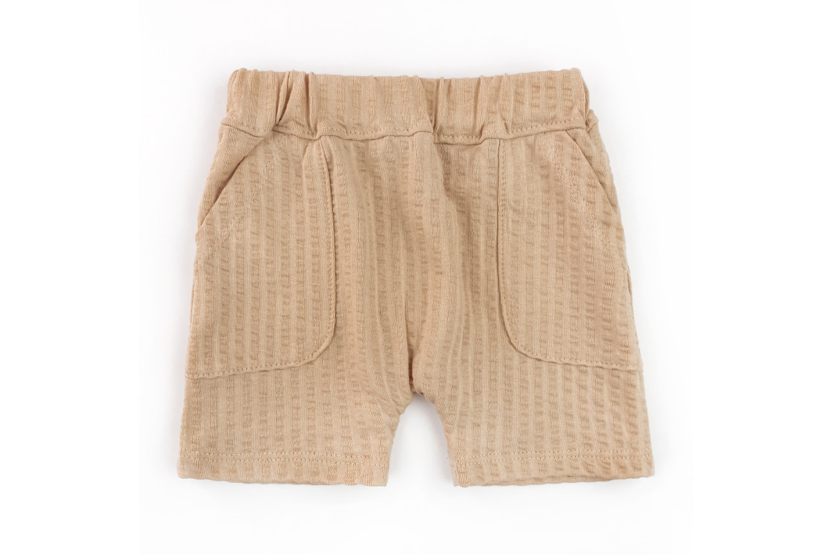 - шорты коричневого цвета на резинке, украшенные карманами.