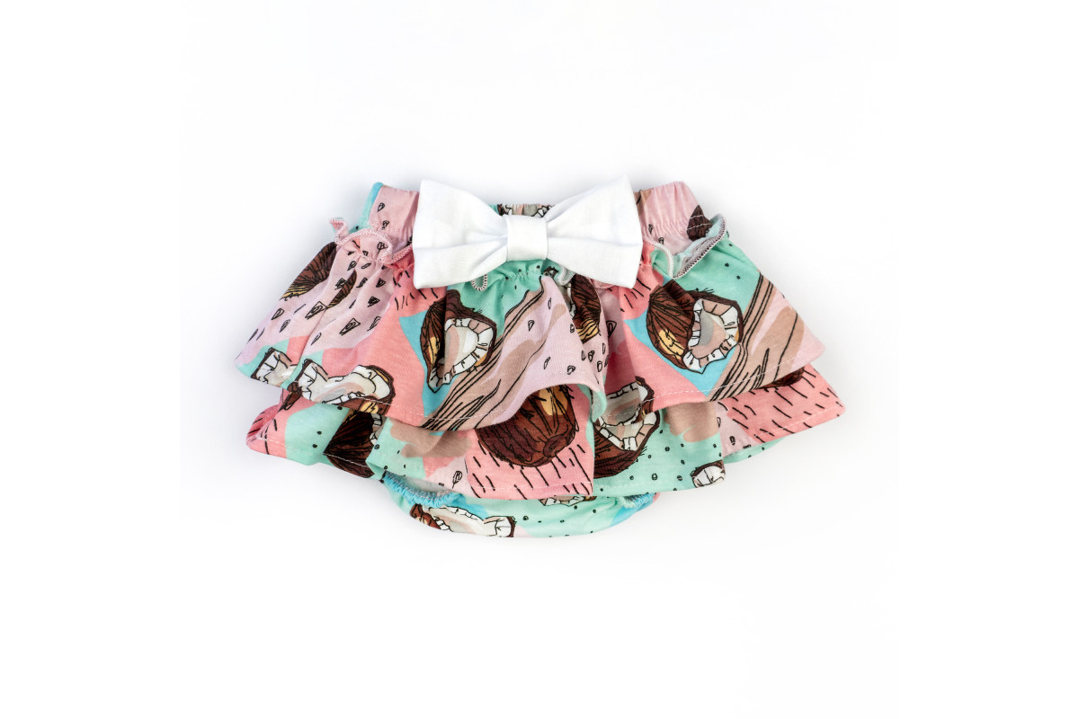- блумеров на резинке с юбочкой и бантиком, с принтом кокосиков;