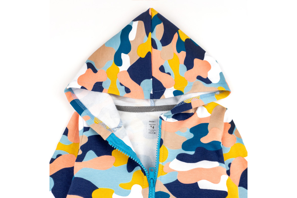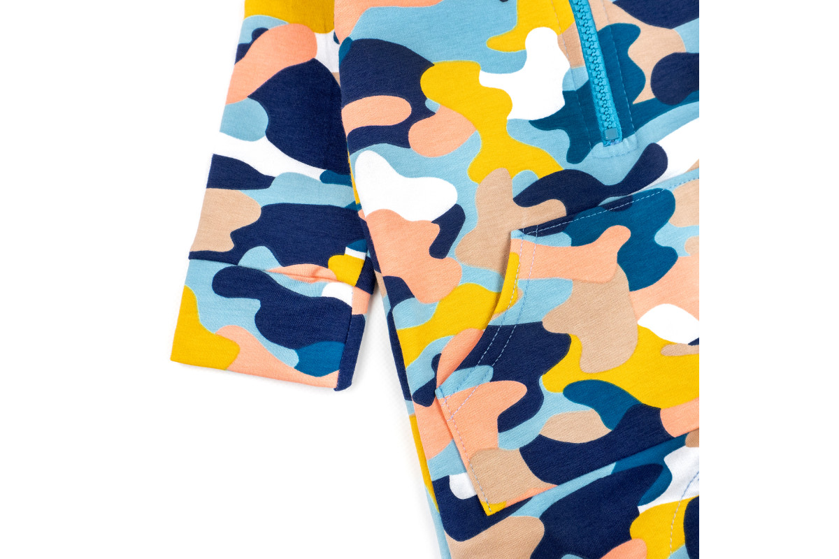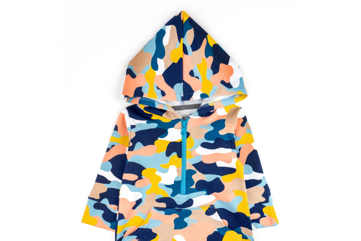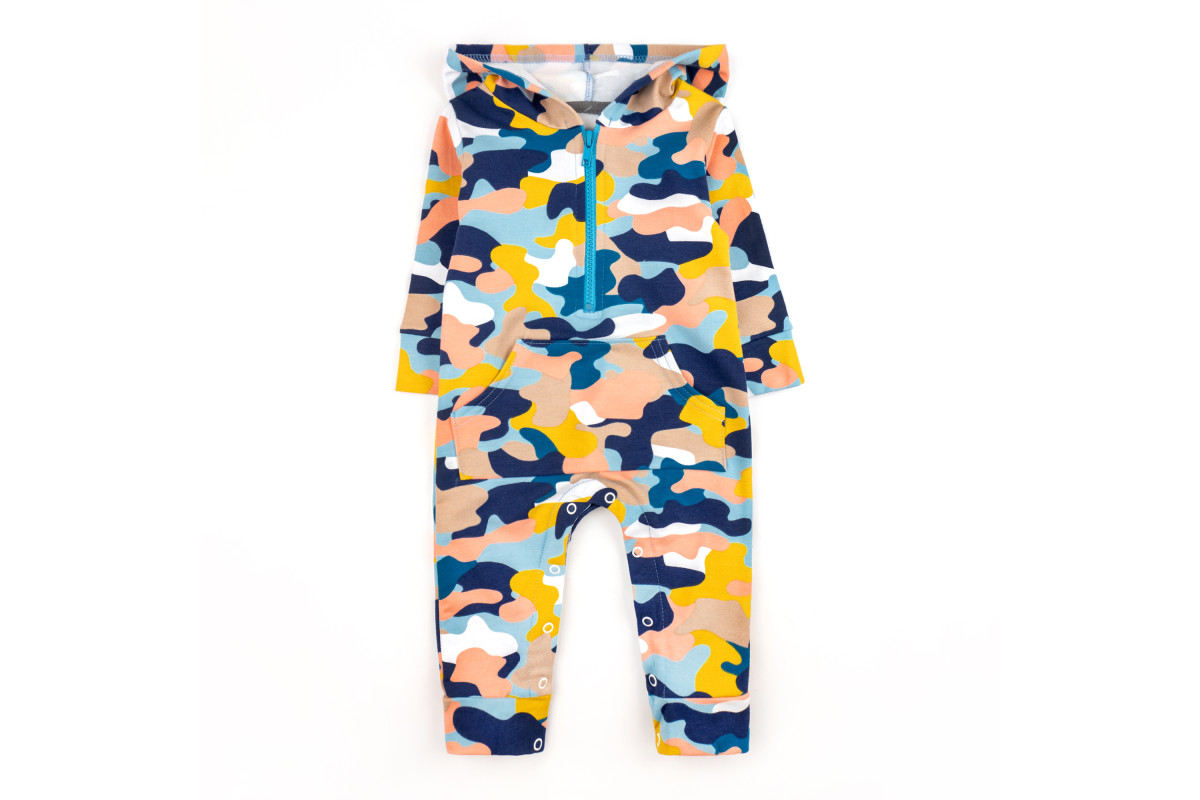 Он имеет капюшон и удобные застежки на молнии и кнопках, между ножками.