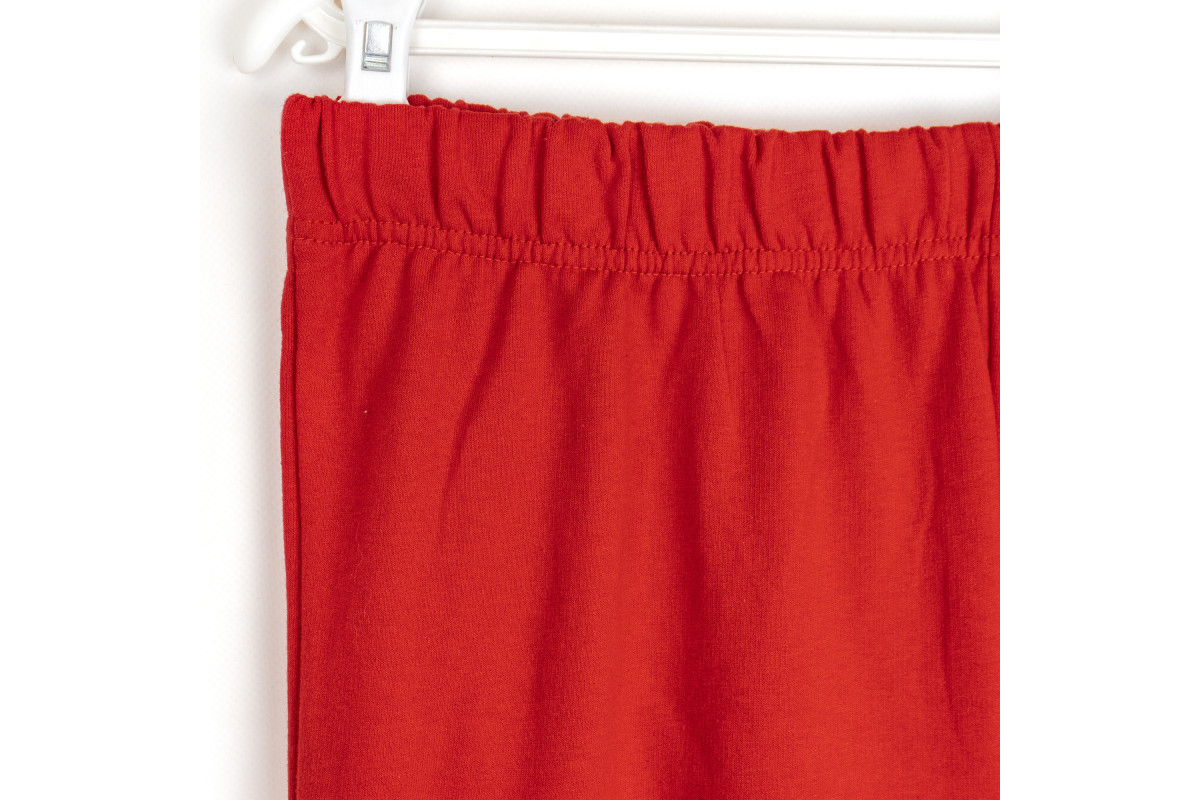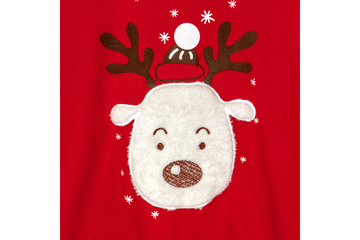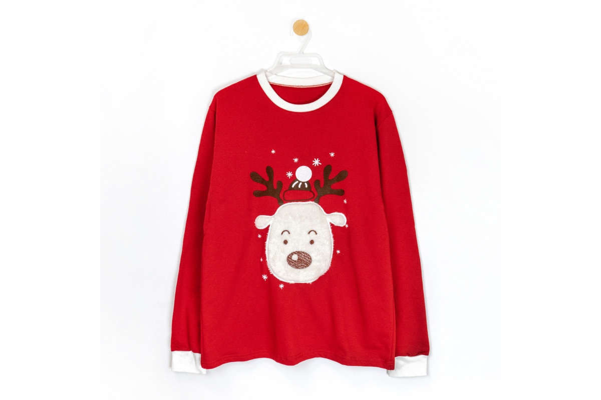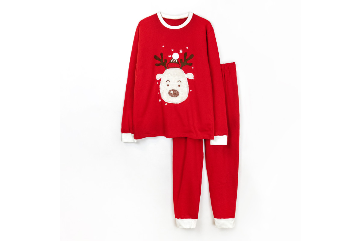 Мужская пижама красного цвета с новогодней аппликацией в виде мордочки оленя.