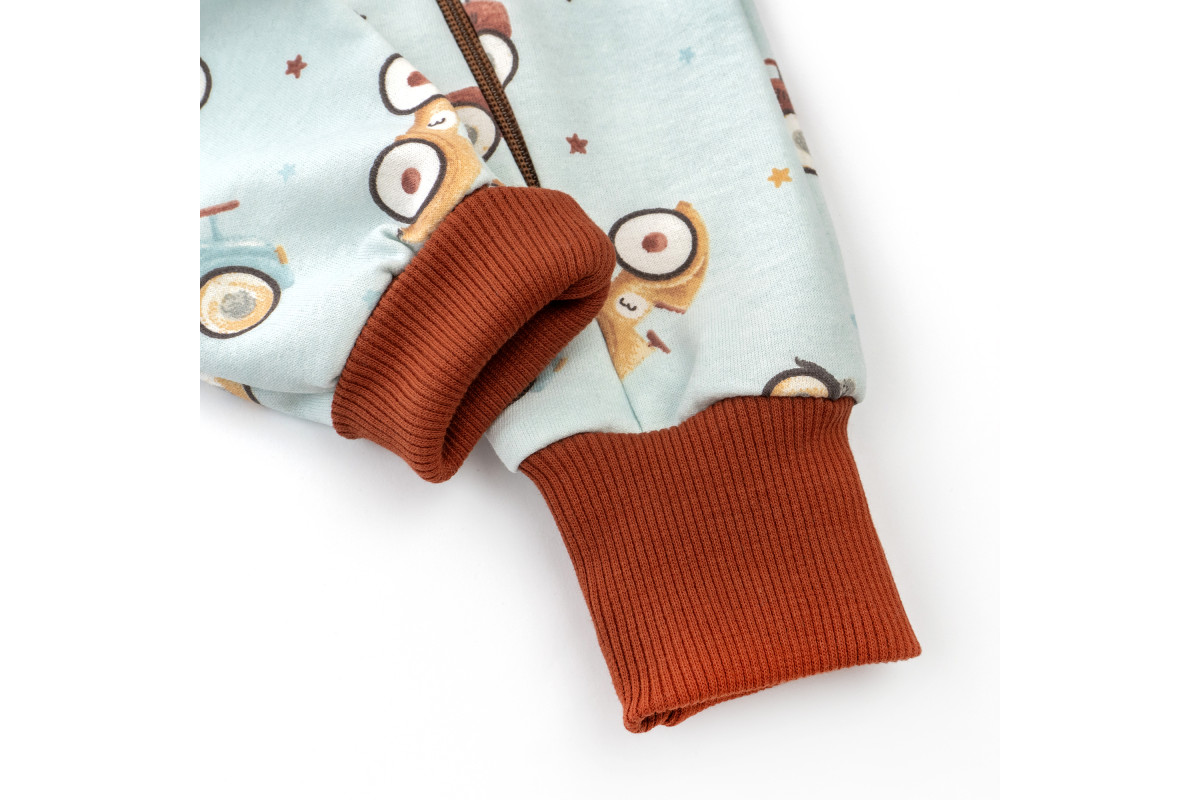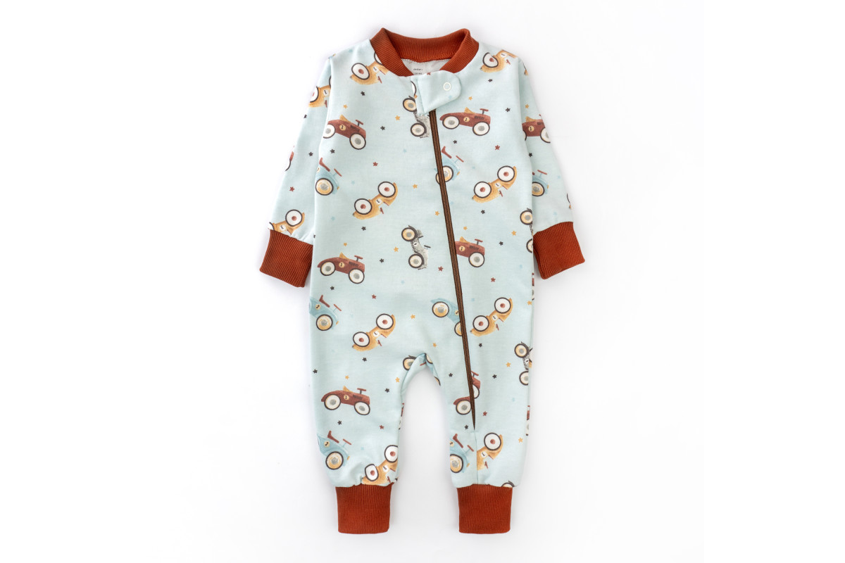Слип застегивается с помощью молнии, идущей по диагонали. Поверх молнии есть "ярлычок" с кнопочкой, который скрывает молнию, чтобы не мешала и не травмировала нежную кожу малыша.
