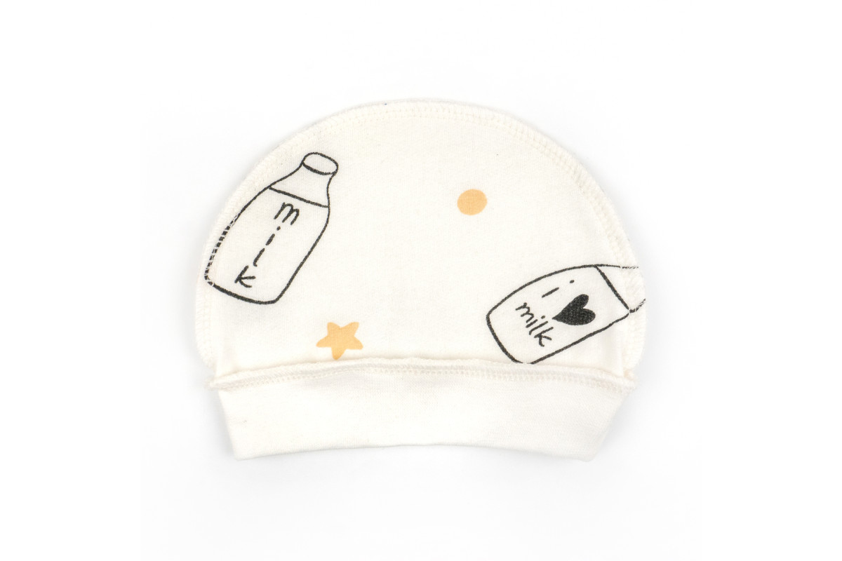 Шапочка в расцветке молочного цвета с рисунками бутылочек молока. Расцветка подойдет и для мальчика, и для девочки.