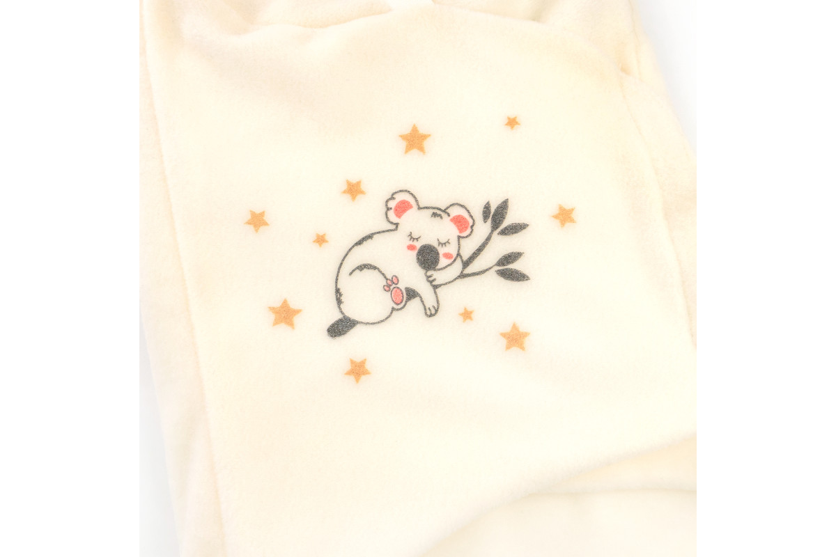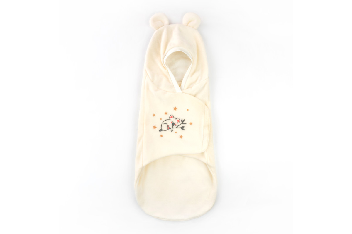 Капюшон кокона декорирован ушками, а также на кокон нанесен принт Коала.