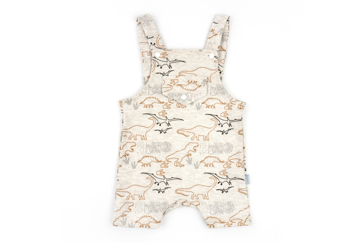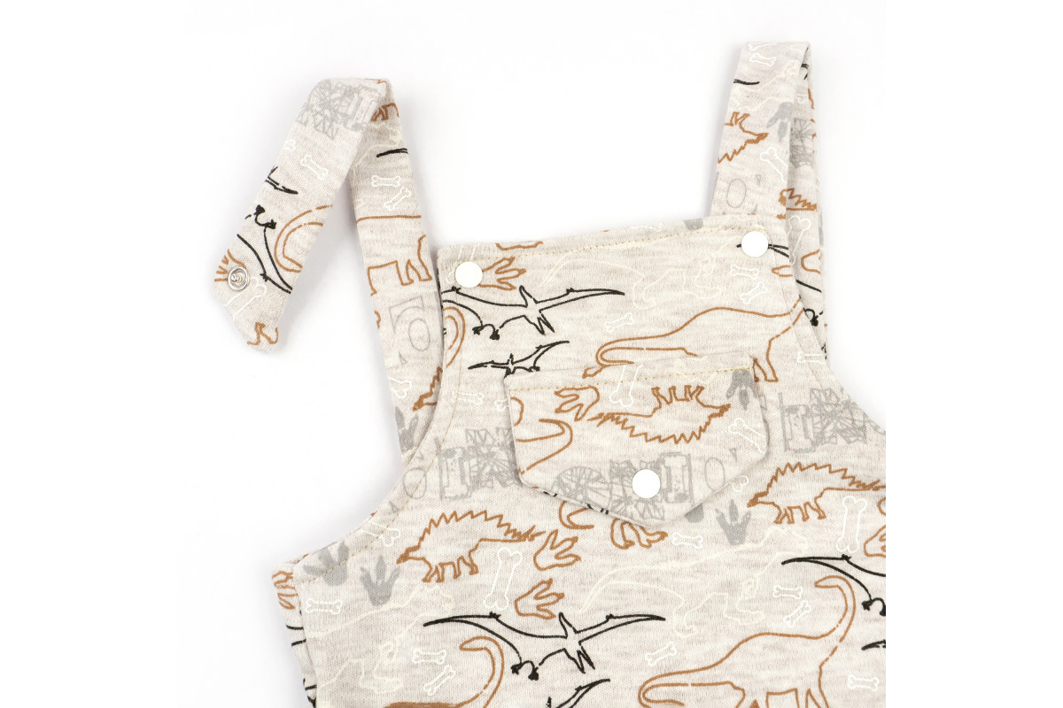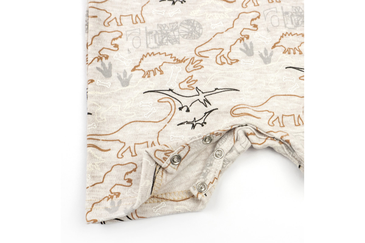 Ромпер бежевого цвета с динозаврами. Футболочка белого цвета с принтом динозаврика на рукаве.
