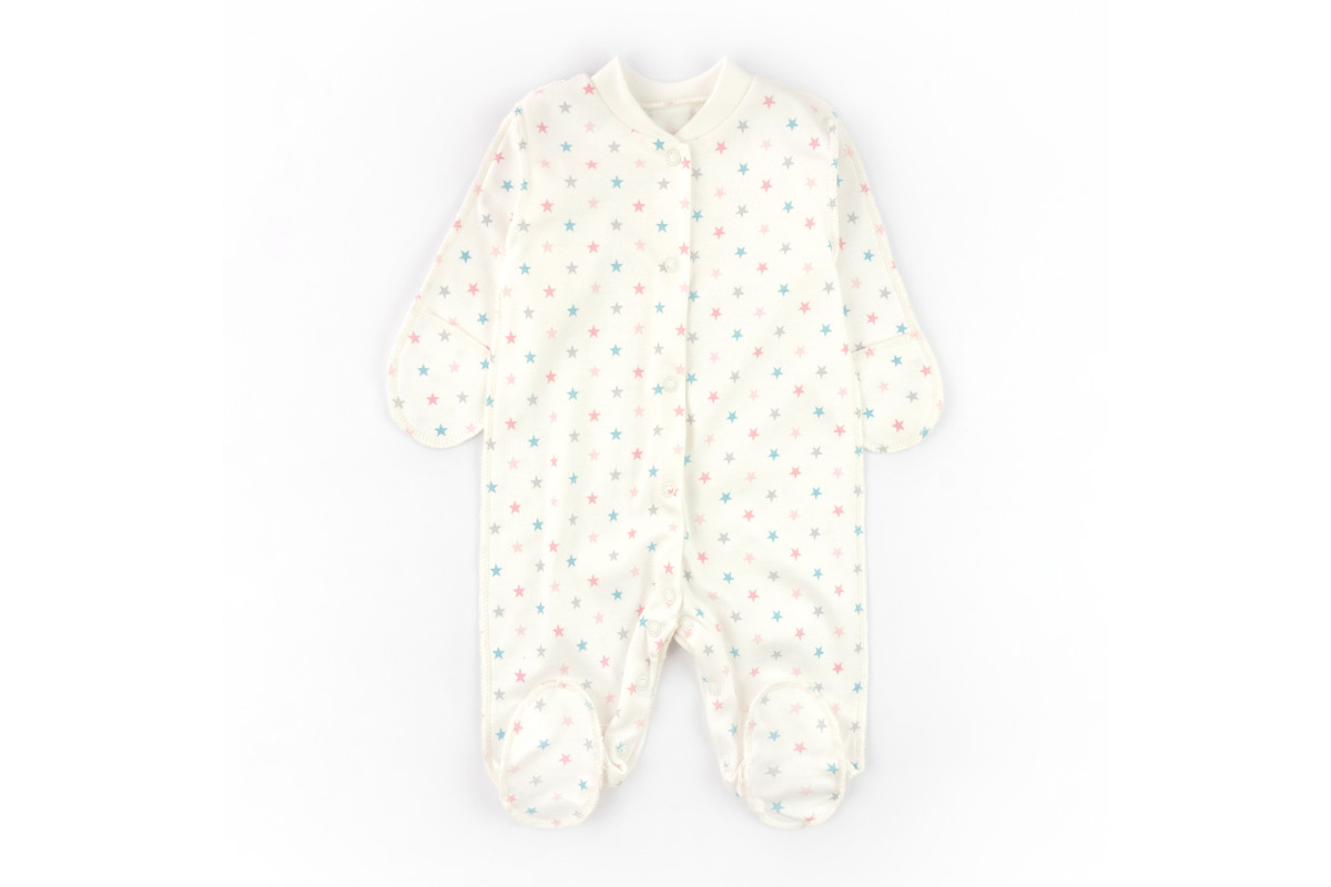 Комбинезон удобен в использовании, кнопки идут сверху вниз по всей длине, что позволяет с легкостью одеть и раздеть ребенка. Ступни ножек закрыты.