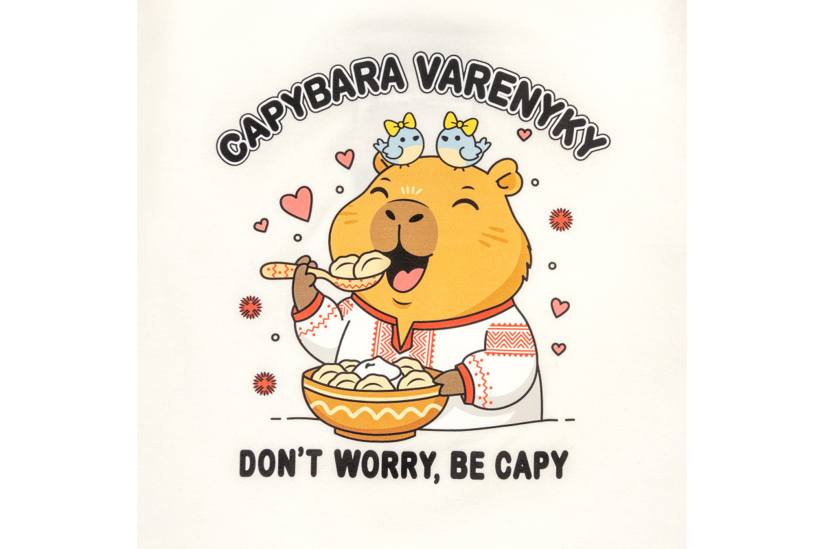 Футболка молочного кольору з яскравим принтом капібари з українською тематикою.