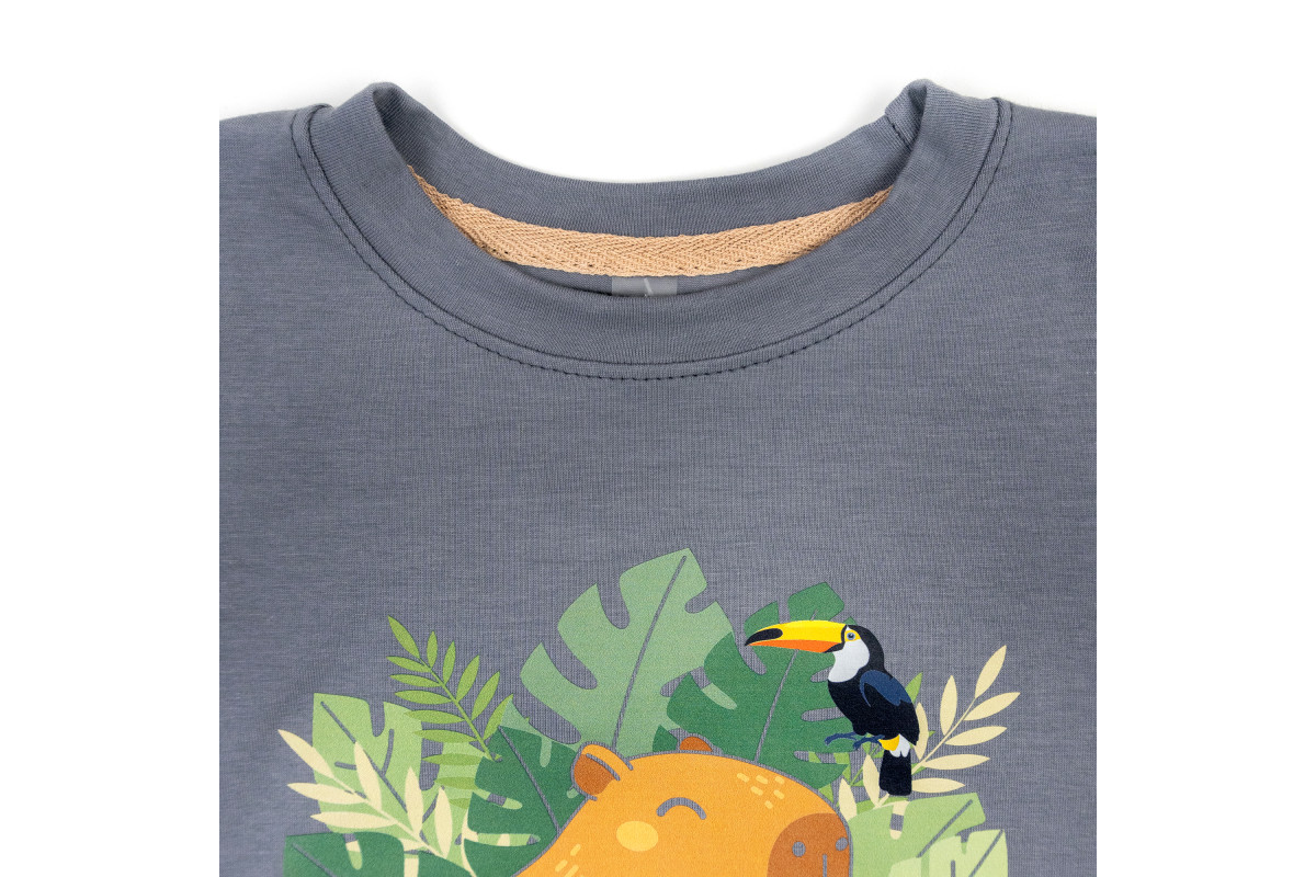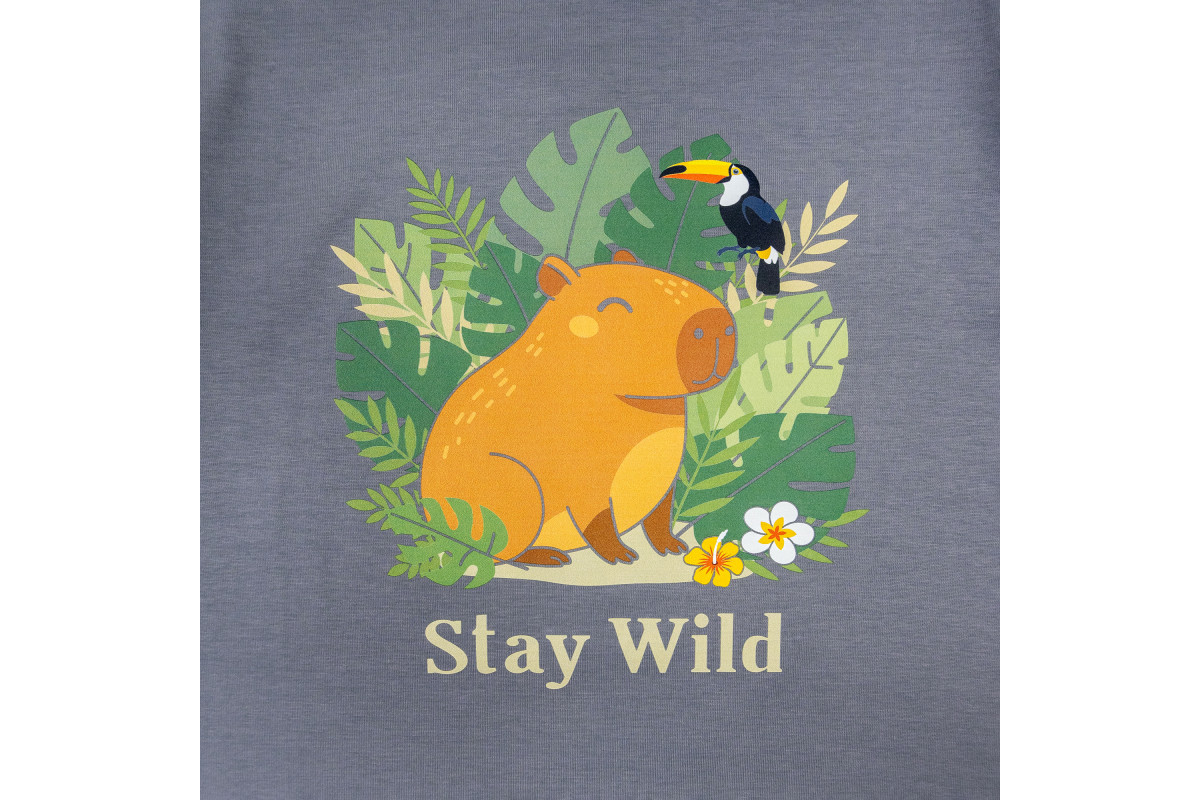 Має забарвлення графітового кольору з яскравим принтом капібари.